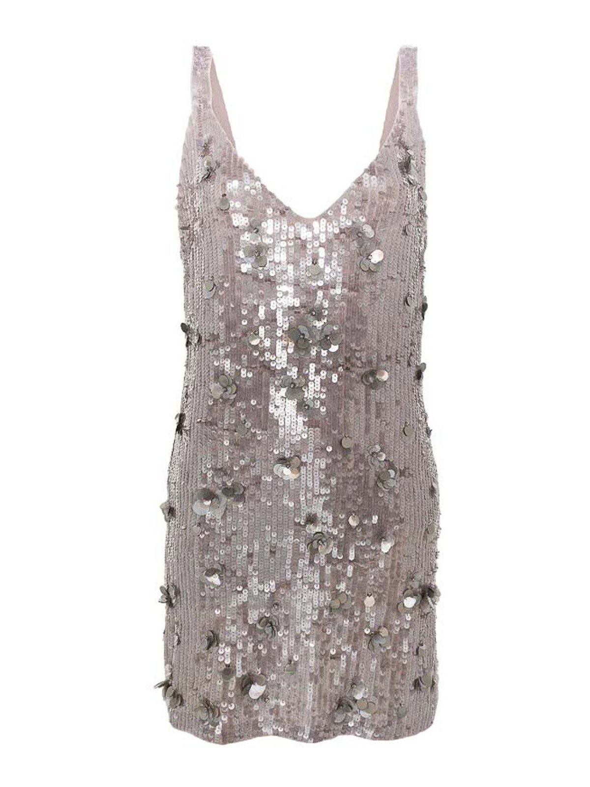 Design extensible gris clair, orné de paillettes, motif floral, col en V, sans manches, carré, dos ouvert, ourlet entièrement droit, style à enfiler