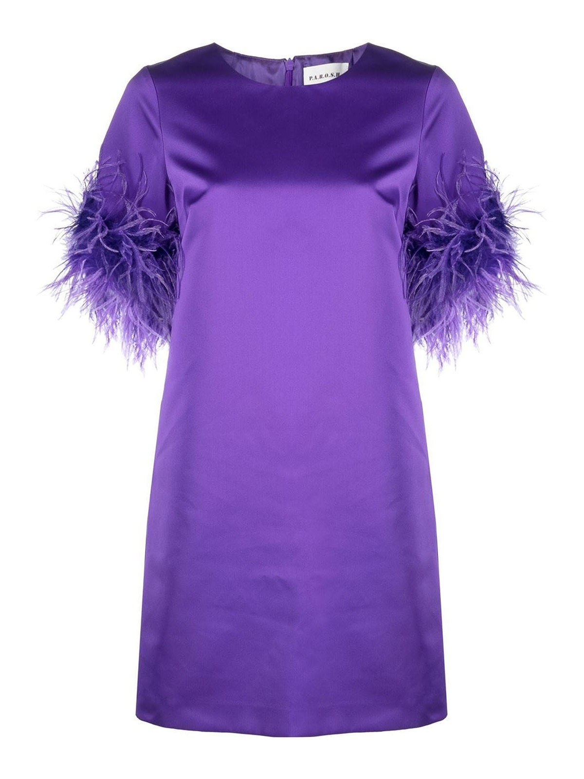 Robe en satin bordée de plumes de la marque p.a.r.o.s.h. ornée de violets, de plumes d'autruche, d'une finition satinée, d'un style droit, de détails en plumes, d'un col rond, d'une fermeture éclair arrière dissimulée, de manches courtes et d'un ourlet droit.