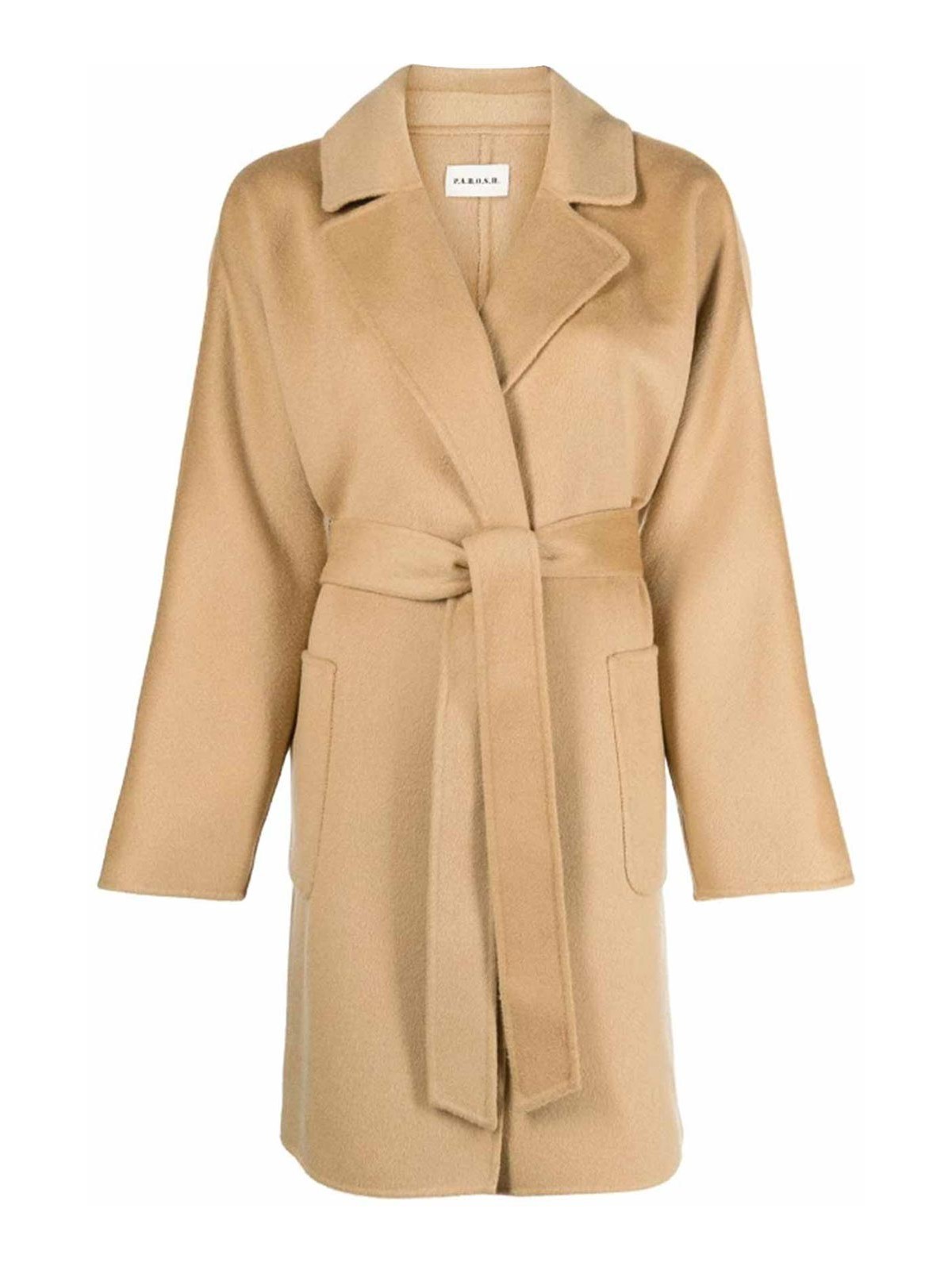Modèle en laine, modèle classique à revers avec ceinture amovible, deux poches plaquées, manches longues au-dessus du genou et ourlet droit, coupe à épaules tombantes.