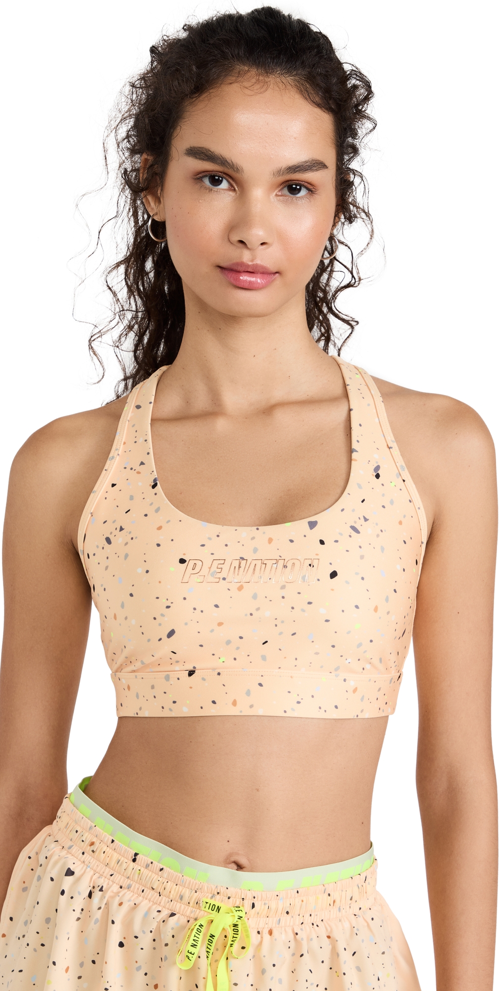 Fabric: Mid-weight compression jersey. Designed for medium-impact workouts like hot yoga and spinning. Scoop neck and racerback. Speckled rock print. Foiled logo at front. Elastic band. Shell: 73% recycled polyester/27% elastane. Lined. Wash cold. Imported, China. Measurements: Measurements from size S Length: 13.5in / 34.0cm, from shoulder