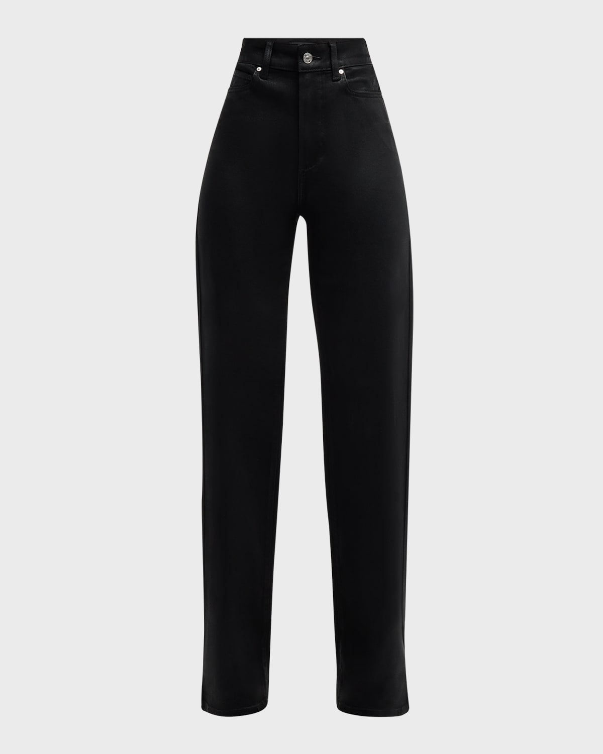 PAIGE "Sasha" wideleg jeans in black coated denim Approx. 11.3" rise; 32" inseam High rise Fivepocket style Straight fit Full length Button/zip fly; belt loops Rayon/cellulose acetate/cotton/polyester Imported