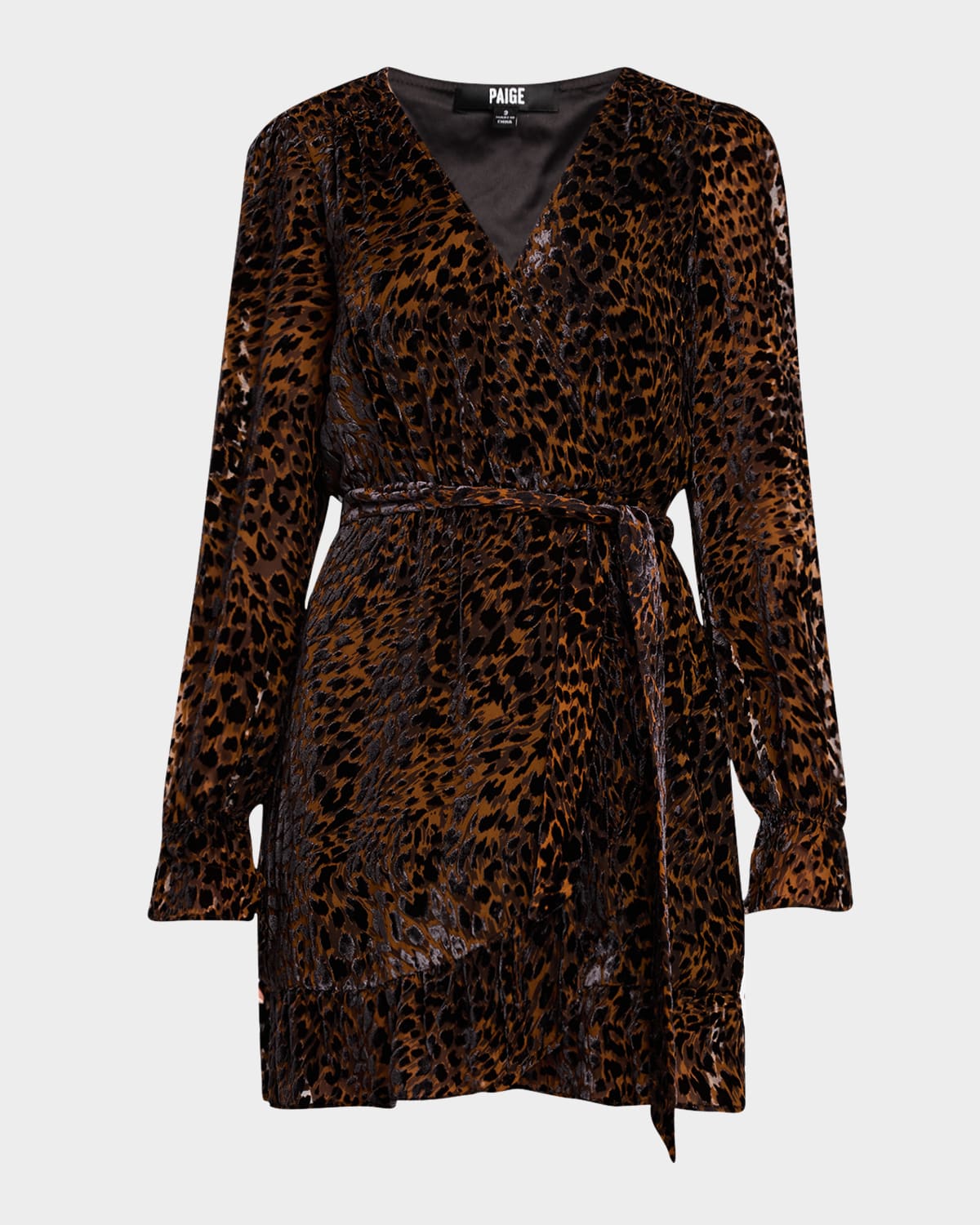 PAIGE "Ysabel" mini dress featuring an allover velvet cheetah motif Surplice neckline Long sleeves with flared cuffs Selftie belt Wrap silhouette Hem falls above the knee Wrap closure Viscose/silk Imported