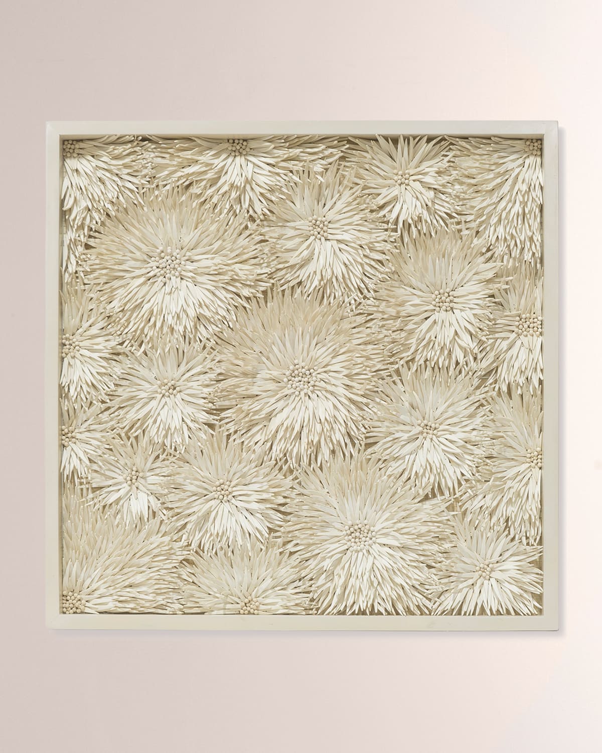 Handcrafted dandelion coco wall décor. 40"Sq. x 2"D. Handcut coconut shells formed into lush, whimsical dandelions. Creamfinished mahogany wood frame. Hanging hardware included. Imported. Boxed weight, approximately 31 lbs.