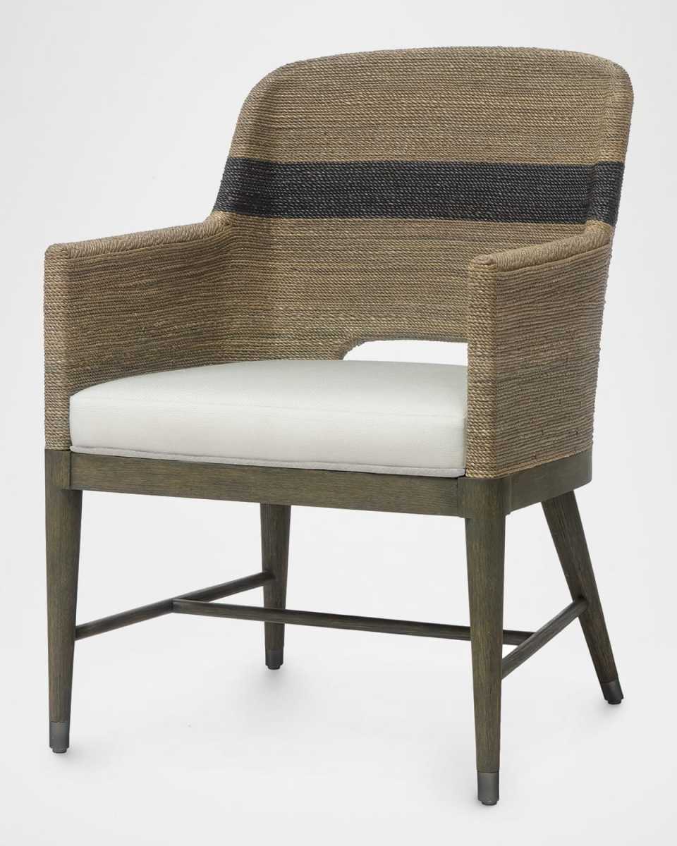The Fritz Rope Dining Armchair hails from the Kirk Nix Collection. It features a hardwood frame, legs in grey with pewter finish foot caps, and a double wall back. The sides feature handtwisted lampakanay rope in a grey finish with black stripes. The chair comes with a fixed upholstered seat in acrylic fabric. Handcrafted of engineered hardwood, rope, and acrylic Overall, approx. 24"W x 25"D x 34"T Seat width, 21" Seat depth, 19.75" Seat height, 18.5" Arm height, 25" Weight, 22.0lbs For indoor use Imported Boxed weight, approximately 34.0lbs