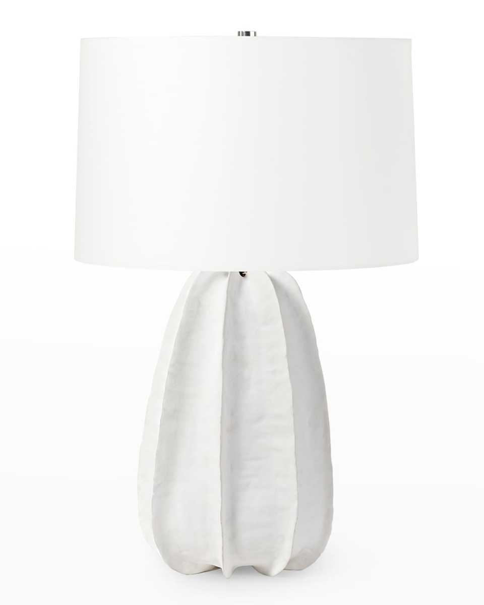 Handcrafted table lamp topped with cream linen tapered shade Made of fine bone China porcelain with aluminium halfcylinder finial Bone china is a durable form of porcelain composed of clay, bone ash and other minerals Uses one 150watt bulb Approx. 14"Dia. x 28"T Hand wash Imported Weight, 16.0lbs Boxed weight, approximately 23.0lbs