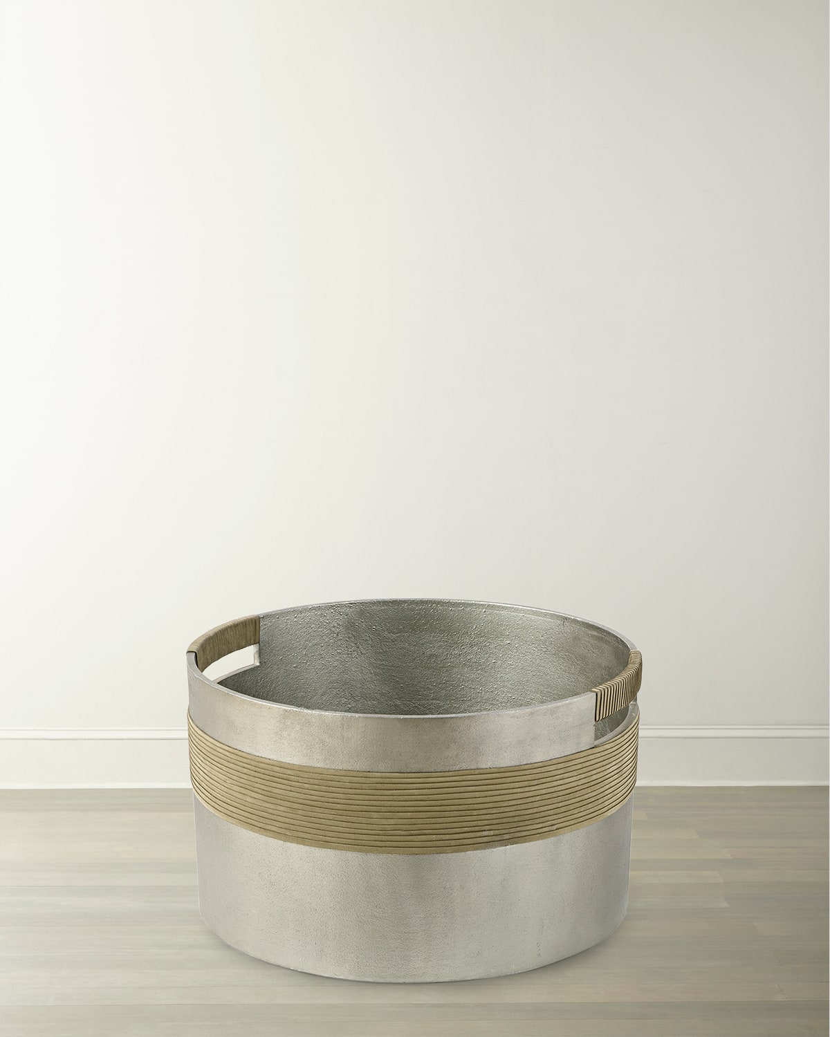 Cast aluminum log holder features leather wrapped around the body and cutout handles. Overall, approx. 17.5"Dia. x 10"T Item Weight (Lbs.): 26.0 Please use caution when handling; we recommend using dedicated fire gloves when moving log holder Spot clean Imported