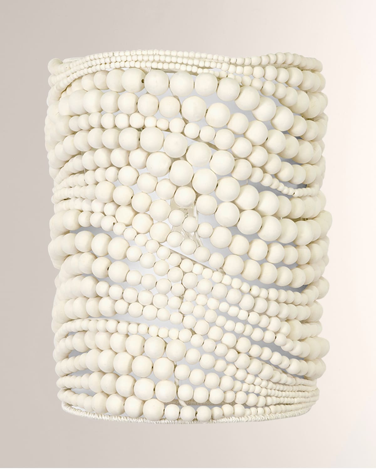 Wood beads in a cream finish handsewn together over the powdercoated metal frame of this sconce. Comes with a cream finished canopy hanging kit. Professional installation recommended. Overall: 11.5"W x 7"D x 14"T. Uses one 60watt candelabra bulb. UL listed. Assembly required. Dust with dry cloth. Imported. Boxed weight, approximately 6 lbs.