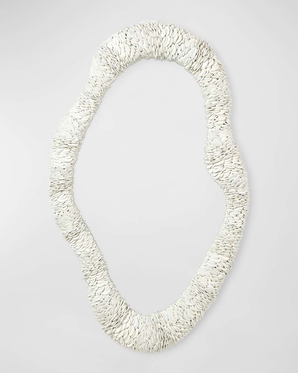 Mirror is made of handcut wood discs in a white finish placed over a fiberglass frame. Can be hung vertically and horizontally Approx. 27"W x 3"D x 35"T Sold individually. Includes hanging hardware Hanging method: metal cleats Spot clean Imported Boxed weight, approximately 29.0 lbs