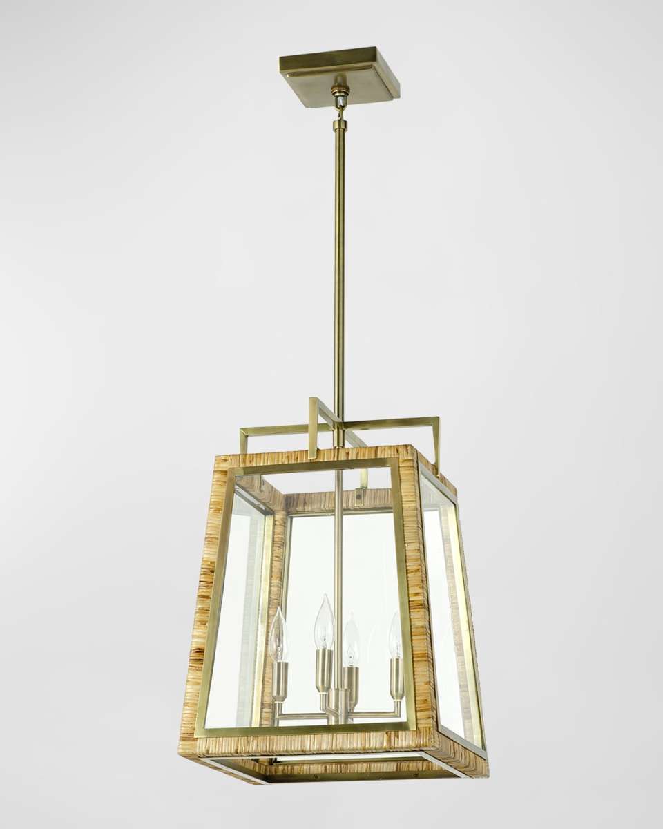Adjustable coastal pendant is ahndcrafted of natural split rattan handwrapped over a wood frame accented with antiqued brass finished metal trim and glass panels. Pendant is complete with a metal canopy hanging kit. Uses four dimmable 40watt e12 type b bulbs LED bulb compatiable Canopy, 6"Sq. x 1.3"T Lampshade Dimensions: 14.5"Sq. x 17.3"T Overall, approx. 10.5"Sq. x 11.8"T UL listed Sold individually. Includes hanging hardware; rods Professional installation is recommended Spot clean Imported Weight, 24.0lbs Boxed weight, approximately 38.0lbs