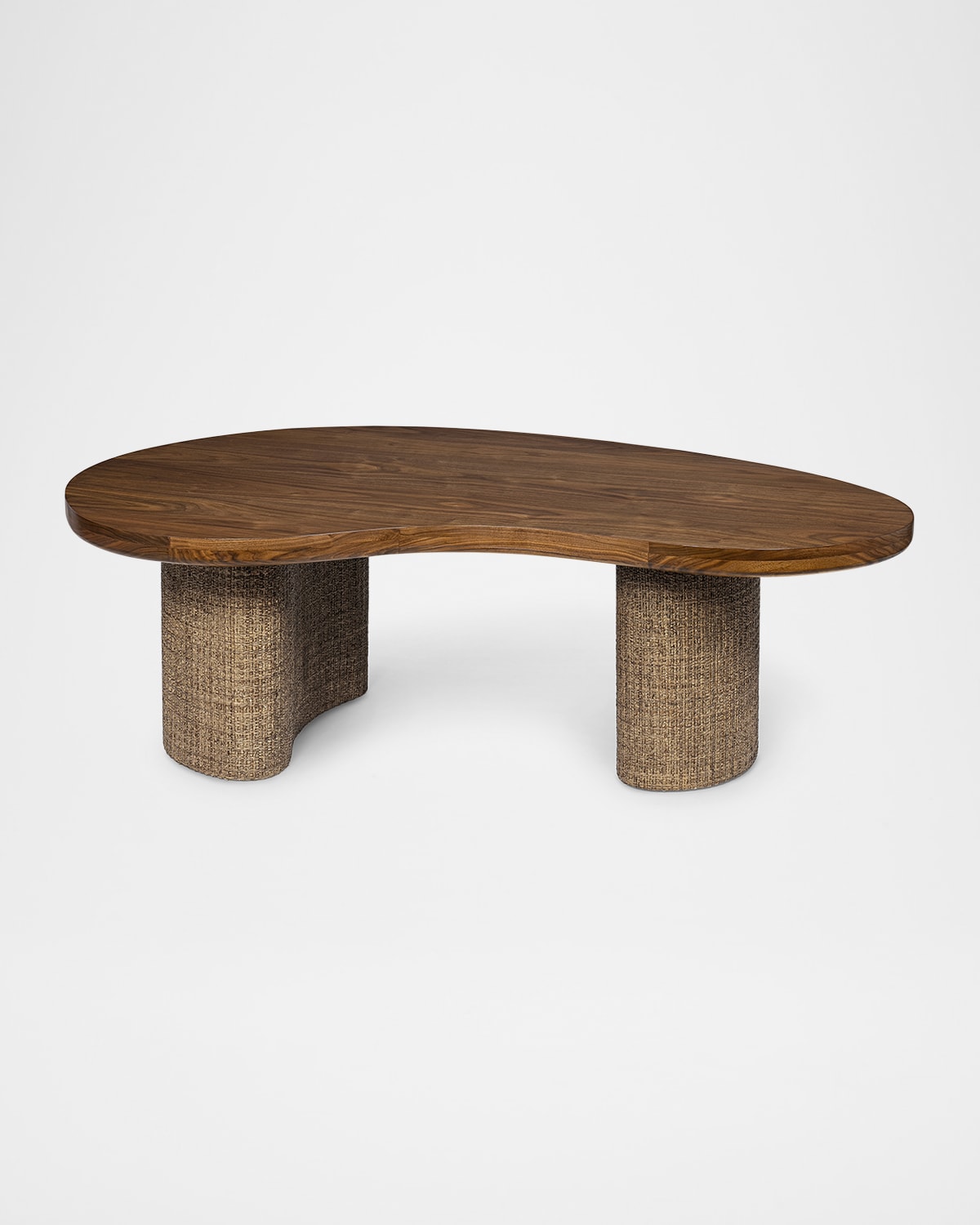Hardwood frame with a walnut top accented with braided raffia legs in a light brown wash finish. Handcrafted of walnut and raffia Overall, approx. 56"W x 32"D x 18"T Item weight, 82.0lbs Finished back Imported Boxed weight, approximately 112.0lbs