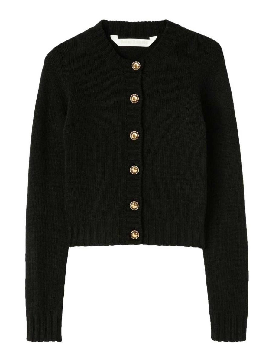Construction en maille mélangée noire, intarsia, logo en tricot, boutons ton sur ton, col rond, bouton, manches longues, ourlet droit