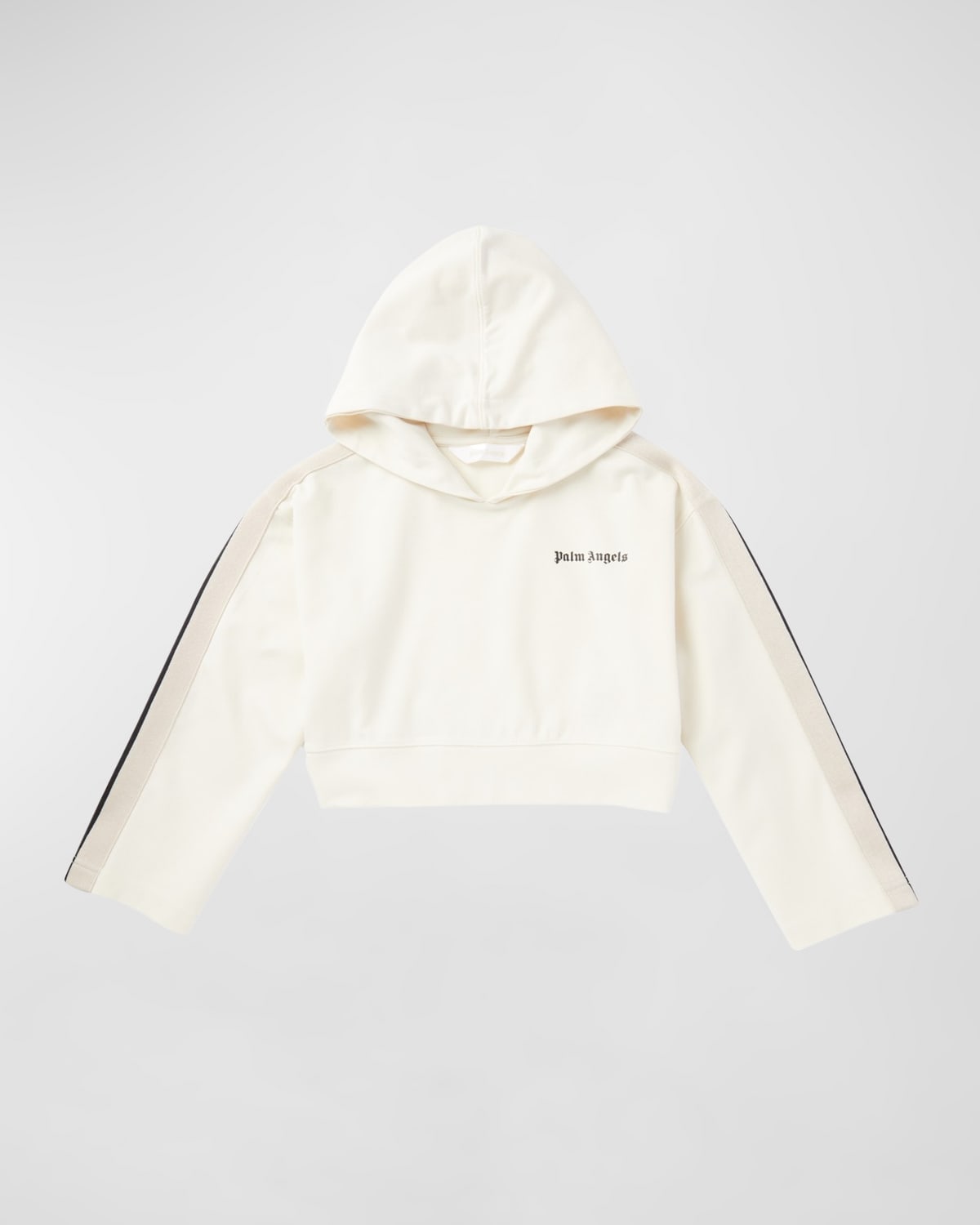 Palm Angels track inspired hoodie with classic logo printed at the chest and stripes down arms Hooded neckline Long sleeves Banded hem Cropped length Viscose/nylon/polyamide/elastane Made in Portugal