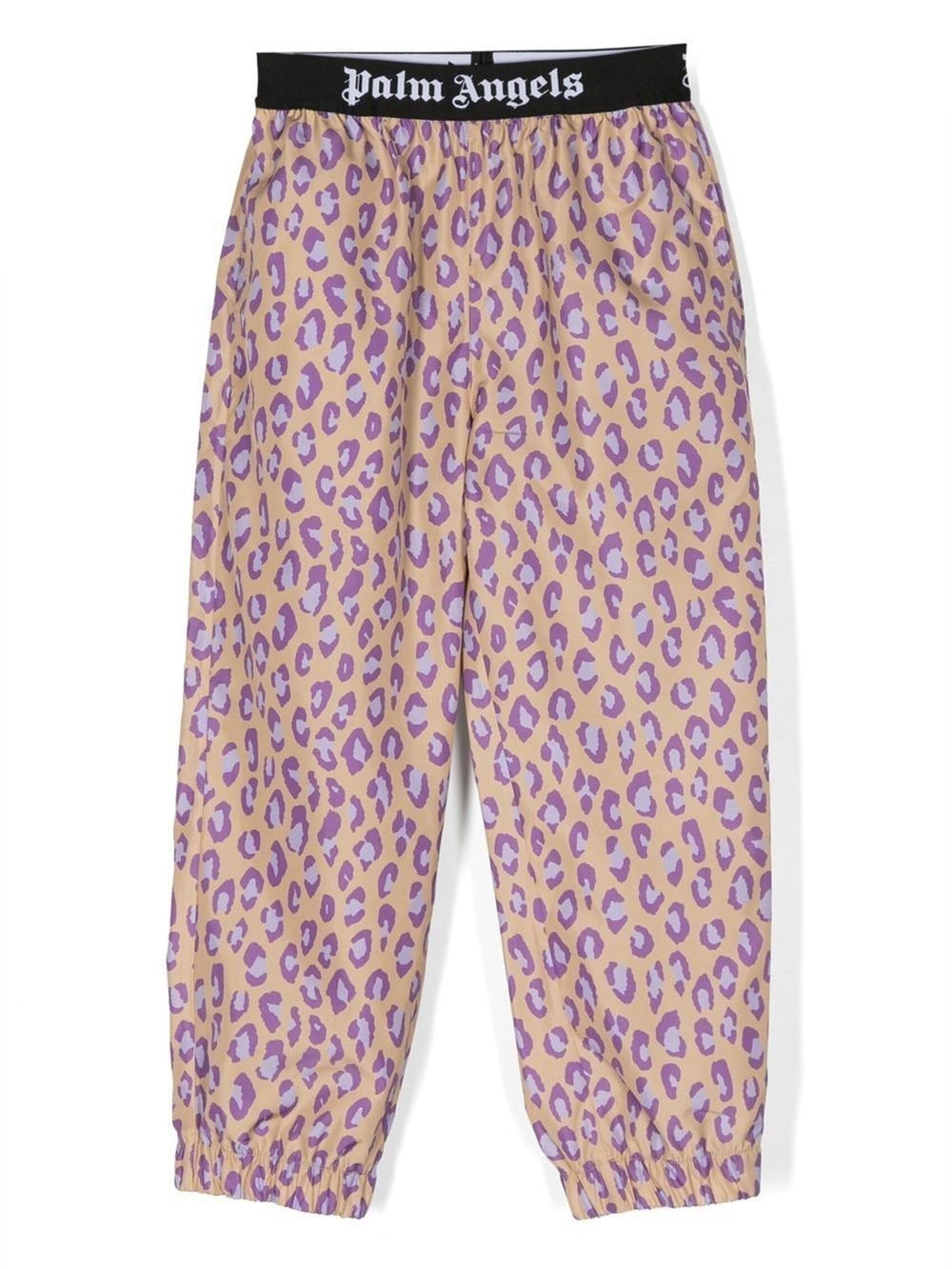 beige/lilac purple stretch-design all-over leopard print logo waistband straight leg elasticated ankles