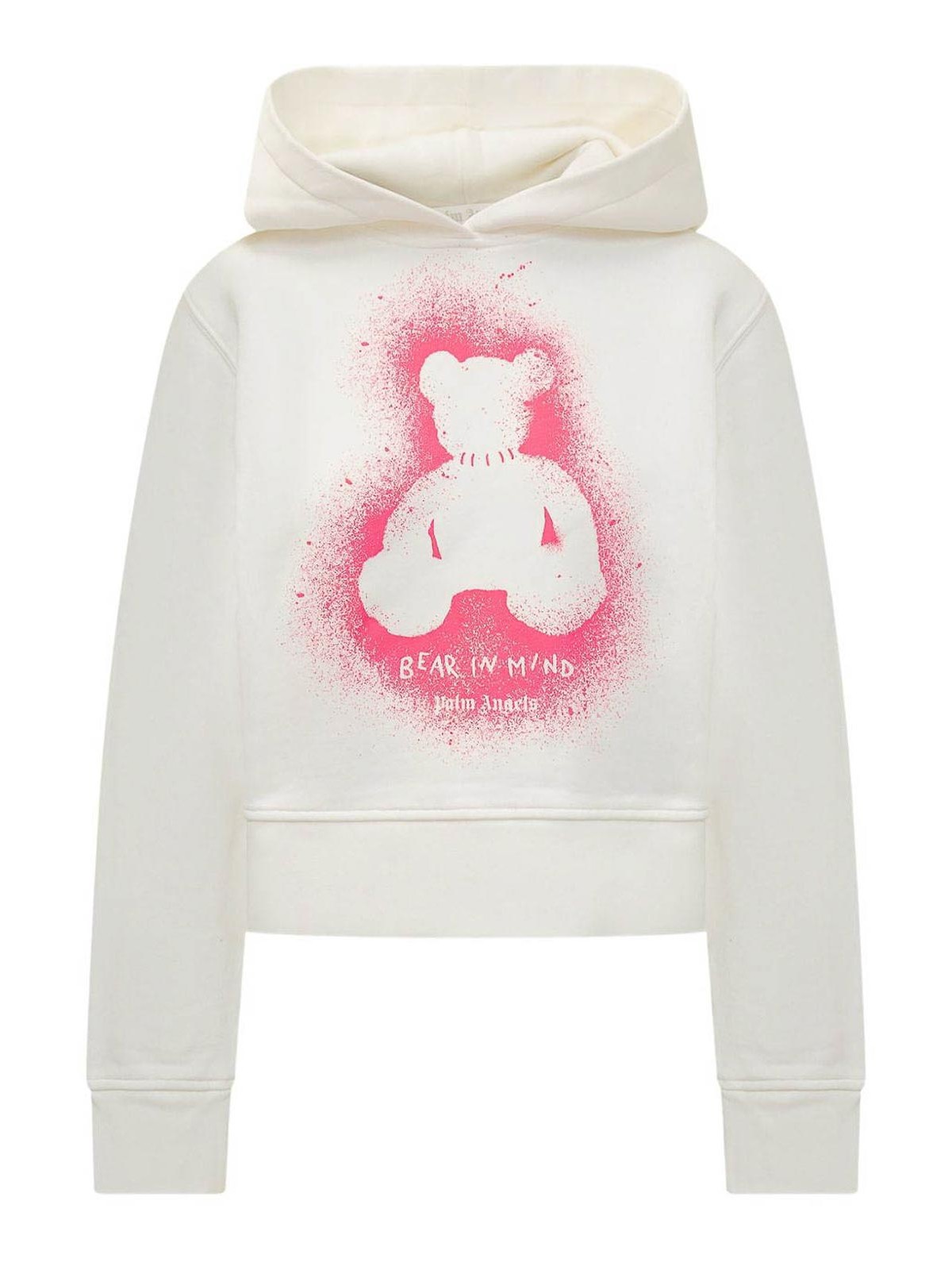 Motif ours effet peinture en aérosol blanc cassé, encolure à capuche, manches longues, ourlet court