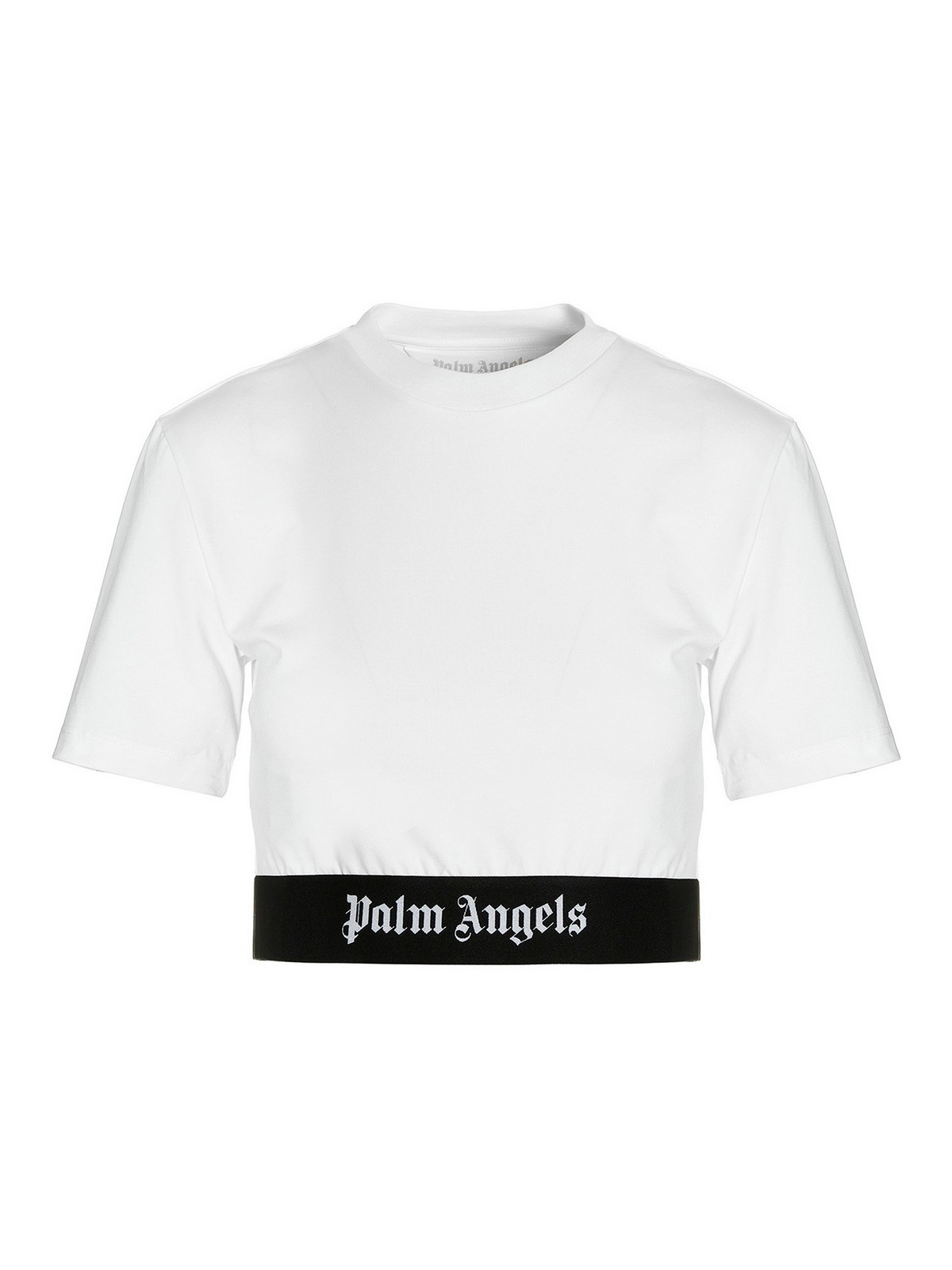 T-shirt ras du cou en coton avec ceinture élastique à logo, manches courtes et style court.
