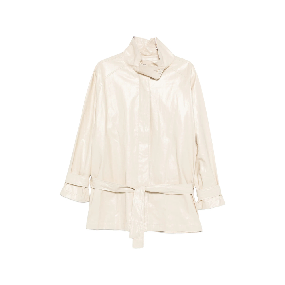 cream beige detachable belt funnel neck long sleeves button fastening layered cuffs