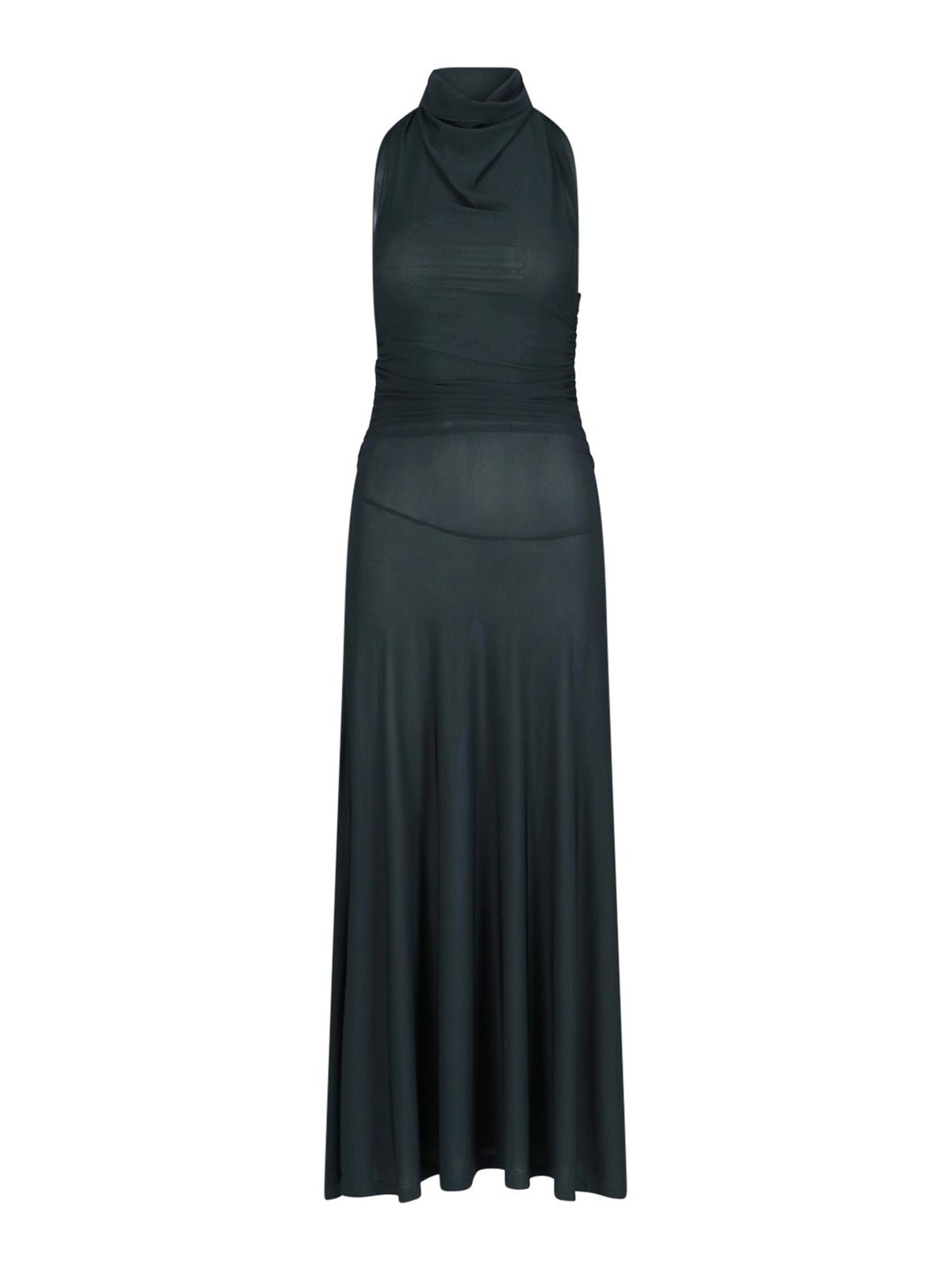 Robe Maxi Halter Blue Paloma Teintes bleu marine drapées sur l'ensemble, col licou ajustable convertible en encolure en V ou en encolure asymétrique foncée.