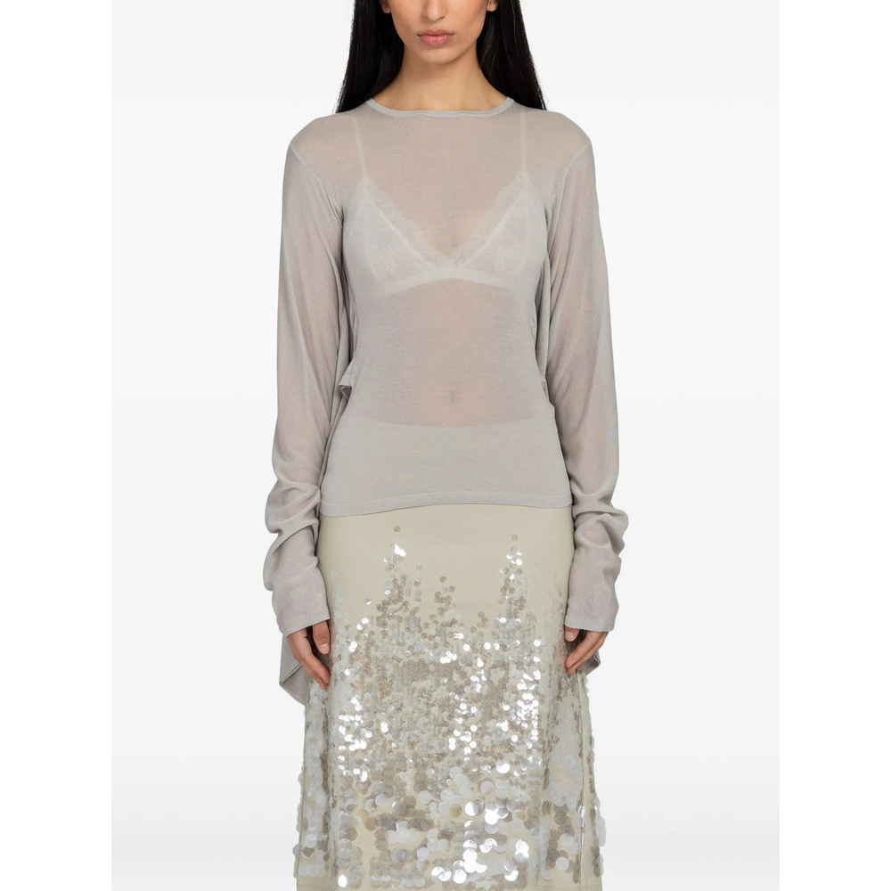 ecru semi-sheer construction crew neck long sleeves draped panel to the sides straight hem