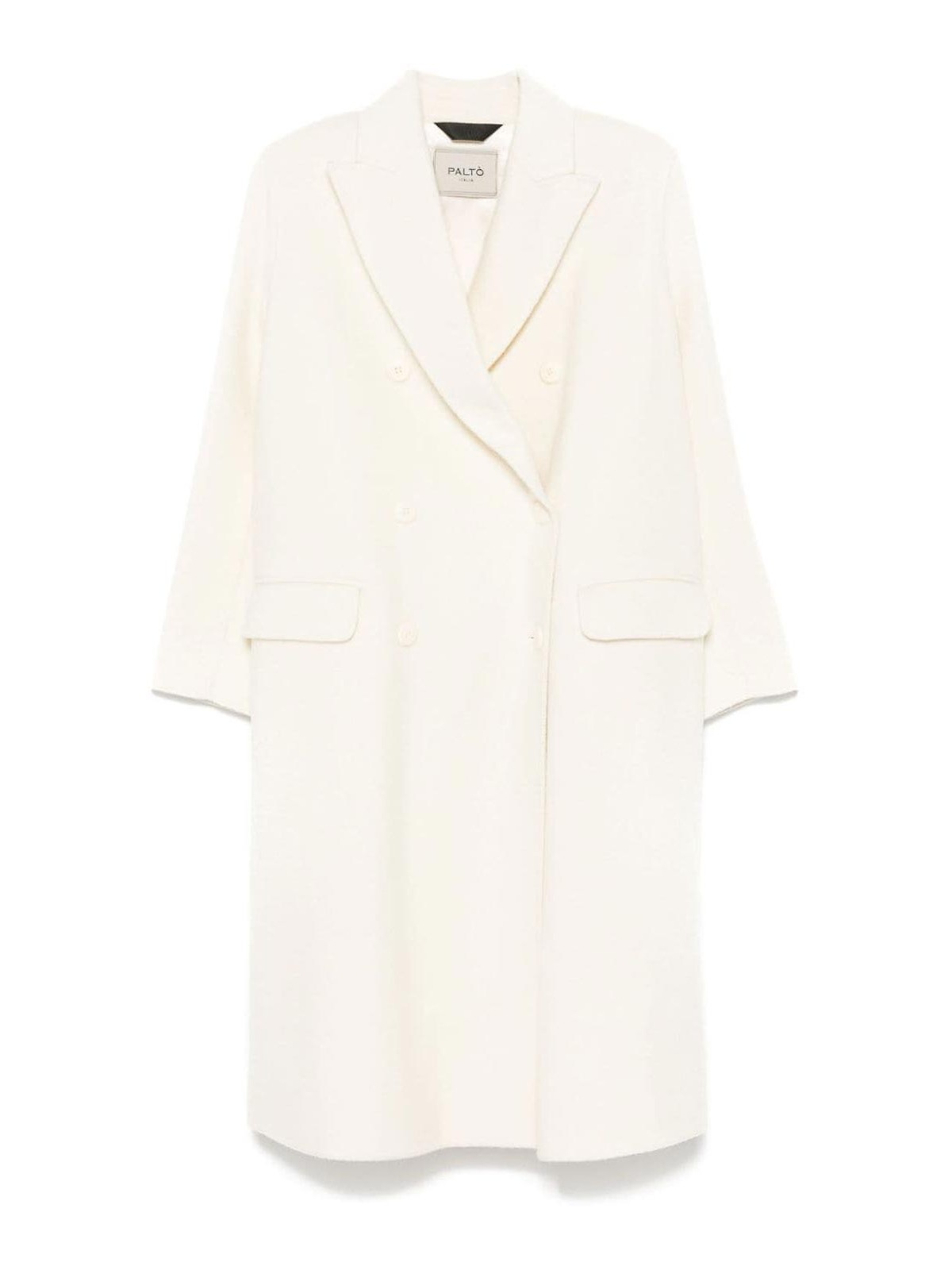 Double boutonnage en feutre blanc mélangé, revers boutonnés, manches longues, deux poches latérales à rabat, ventilation arrière centrale, ourlet partiellement droit