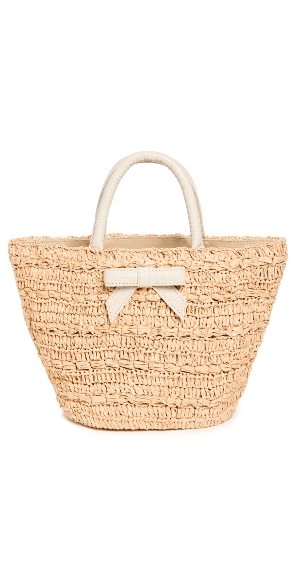 Woven raffia. Croc-embossed rolled handles and decorative bow. Open top. Patch interior pockets. Lining: Textile. Weight: 16oz / 0.45kg. Imported, India. Measurements: Height: 8.75in / 22cm Length: 12.5in / 32cm Depth: 5.5in / 14cm Handle drop: 4in / 10cm