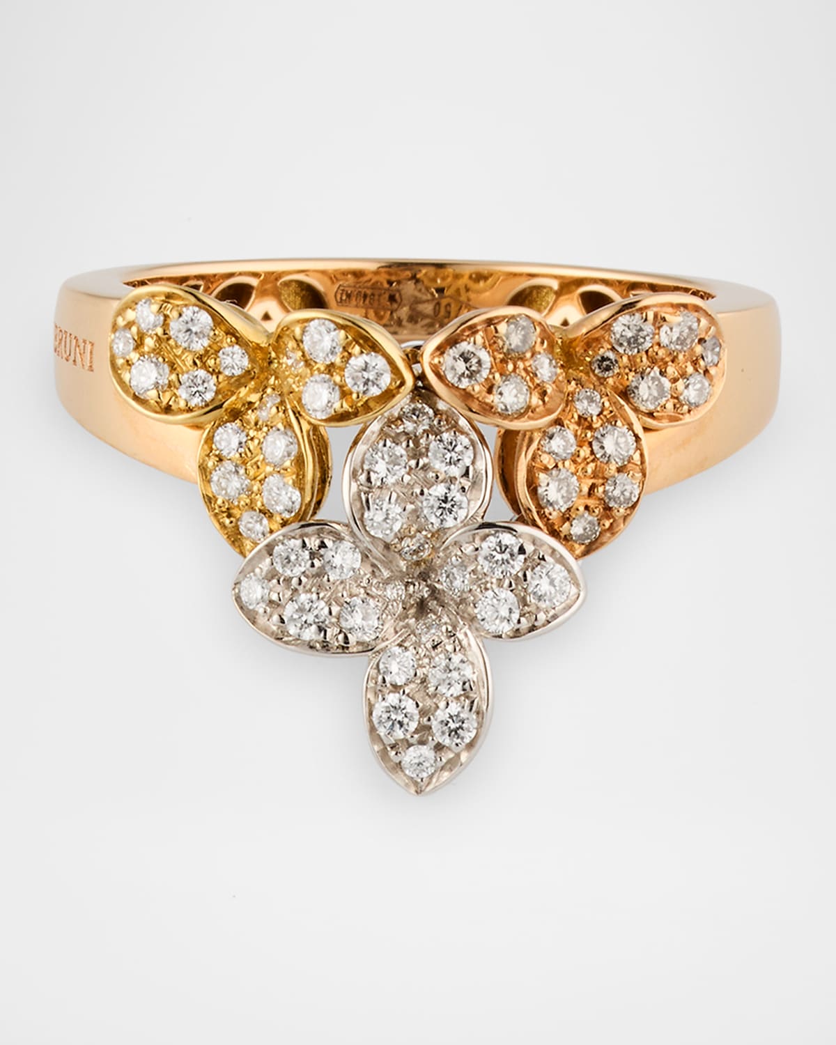 Pasquale Bruni tricolor ring 18karat yellow, white and rose gold Each petal is set with diamonds Diamond total carat weight: 0.41 Made in Italy