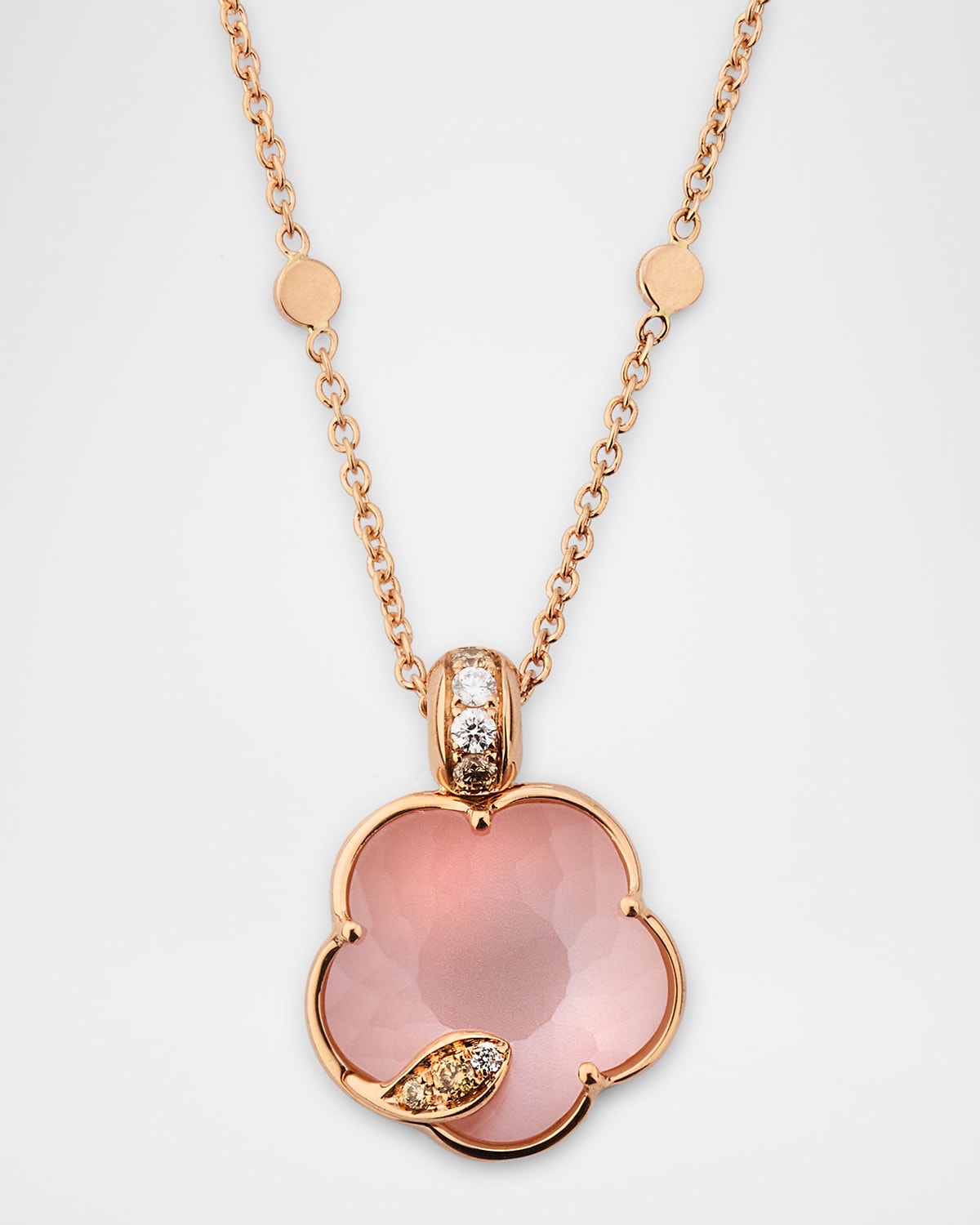 Pasquale Bruni necklace Necklace length: approx. 16.5 inches (adjustable) 18karat rose gold White and champagne diamonds Pink moonstone 0.12 total diamond carat weight Springring clasp Made in Italy