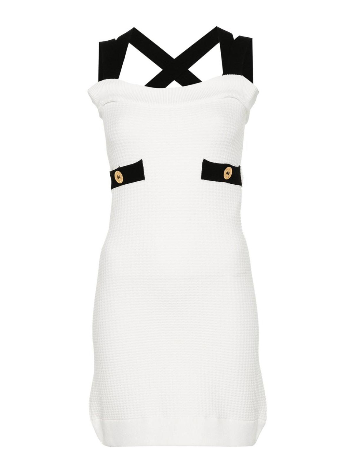 Robe à bretelles doubles, construction en maille D noire et blanche, finitions contrastées, col carré, double épaulettes sans manches, boutons décoratifs avec logo, chenille au dos, ourlet côtelé, style à enfiler