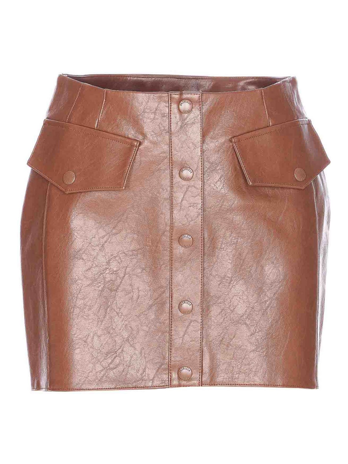 Mini-jupe Patrizia Pepe, marron, boutons, écusson, logo au dos. Nom de la couleur du créateur: marron