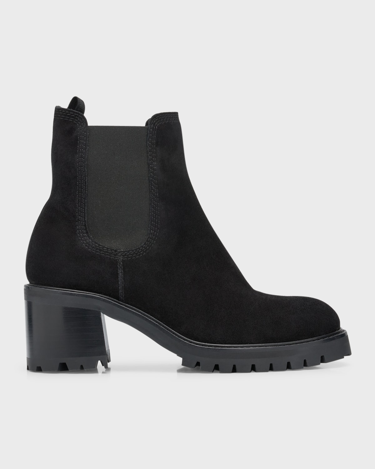Pedro Garcia "Zona" velour ankle Chelsea booties. 2.4" stacked heel. Round toe. Gored sides. Pullon style. Lugged rubber outsole. Made in Italy.