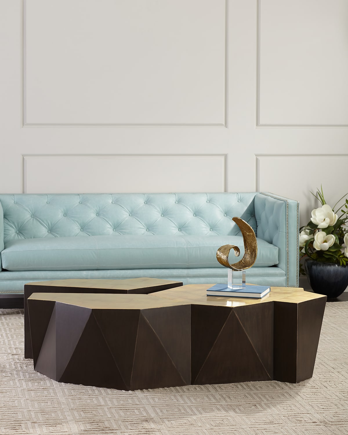 Handcrafted threepiece modular coffee table. Its handapplied gold leaf finish makes this a great centerpiece for a traditional as well as a transitional or modern living space. Can be separated into three small tables for entertaining in style. Handfinished gold leaf top. Hardwood base. 65"W x 39"D x 17.5"T. Imported. Boxed weight, approximately 165 lbs.