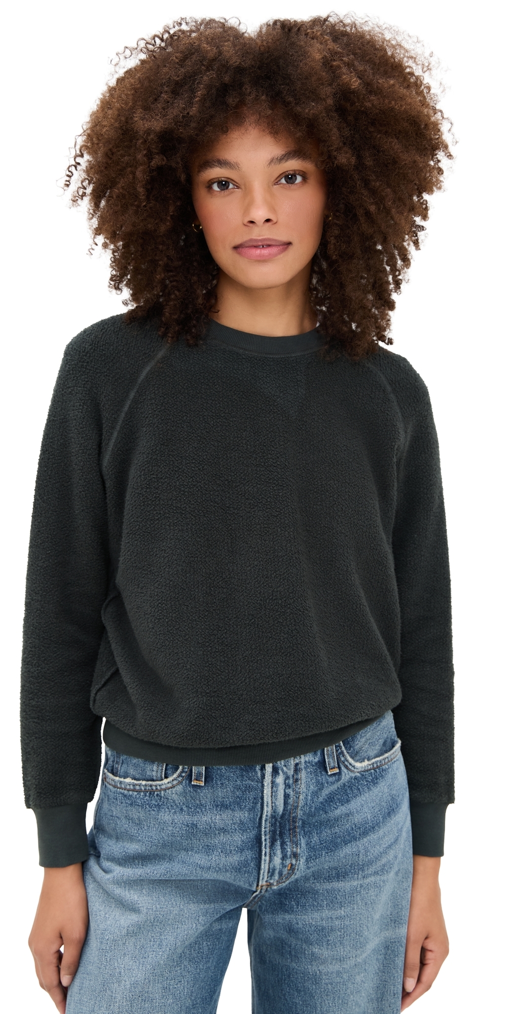 Fabric: Lightweight stretch fleece. Ribbed edges. Crew neck. Long sleeves. Shell: 100% cotton. Hand wash. Made in the USA. Measurements: Measurements from size S Length: 22in / 56.0cm, from shoulder