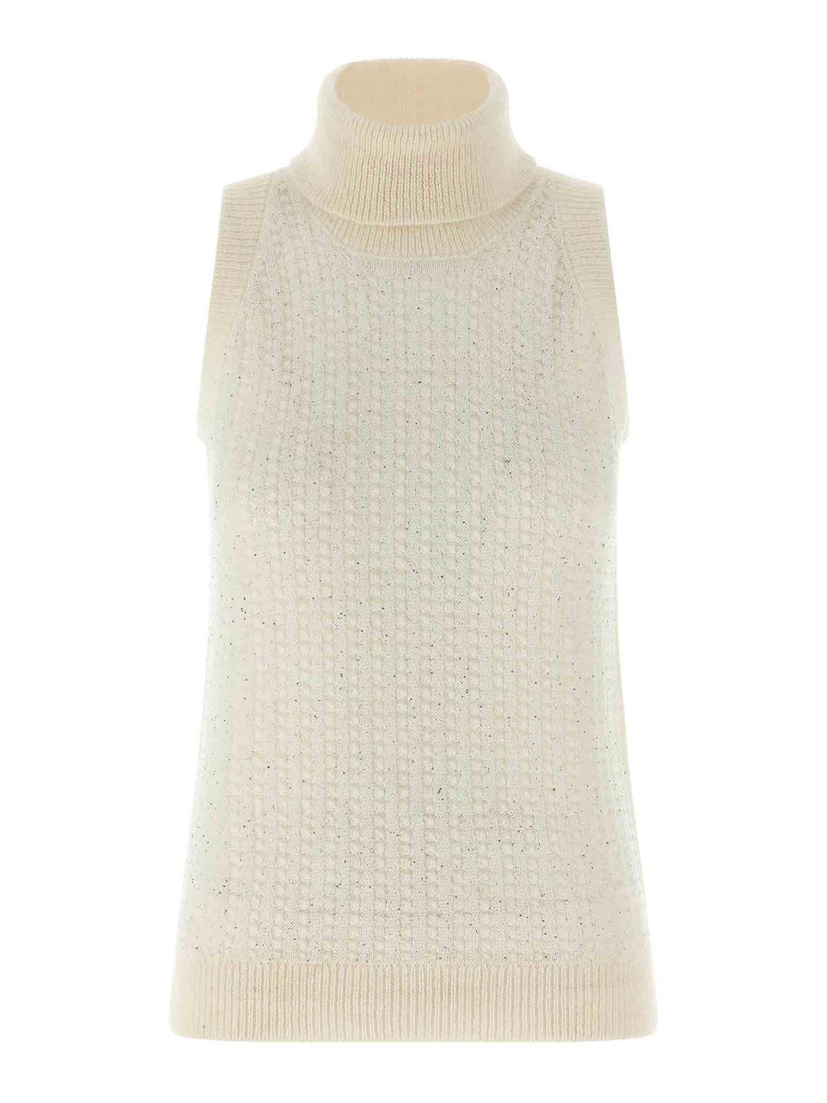 Pull tricoté en laine d'alpaga et tricoté avec sequins appliqués, retourné, col haut, sans manches