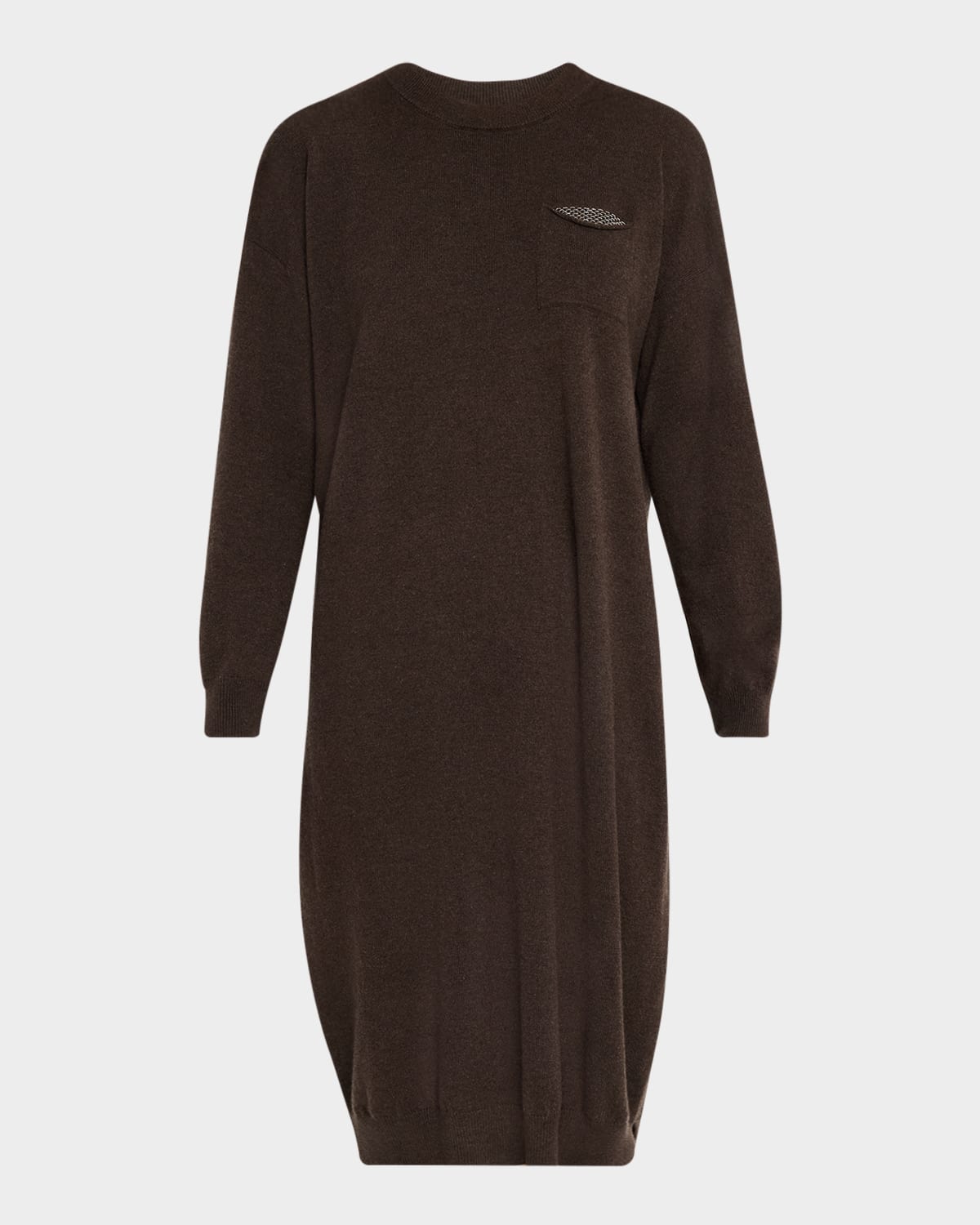 Peserico sweater dress in a tricot knit with signature chain detail Approx. 40"L from shoulders to hem Crew neckline Drop shoulders Long sleeves; approx. 17.5"L Side slit hem Hem hits around the knee Shift silhouette Slipover style Virgin wool/silk/cashmere Unlined Hand wash or dry clean Made in Italy