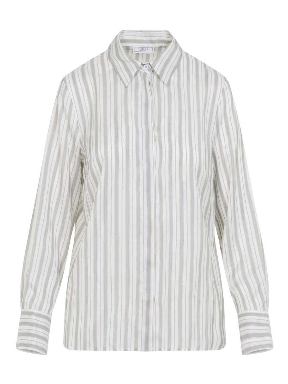 Chemise à rayures blanches opales Peserico, chemise pure, col pointu, manches longues boutonnées, poignets boutonnés, ourlet droit, motif à rayures blanches opales, marron et gris sur l'ensemble