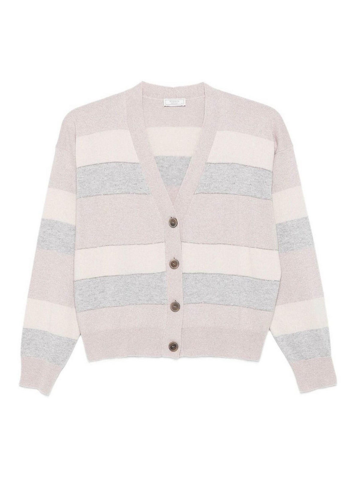 Col en V à rayures horizontales beiges, manches longues, fermeture boutonnée sur le devant, bordure côtelée