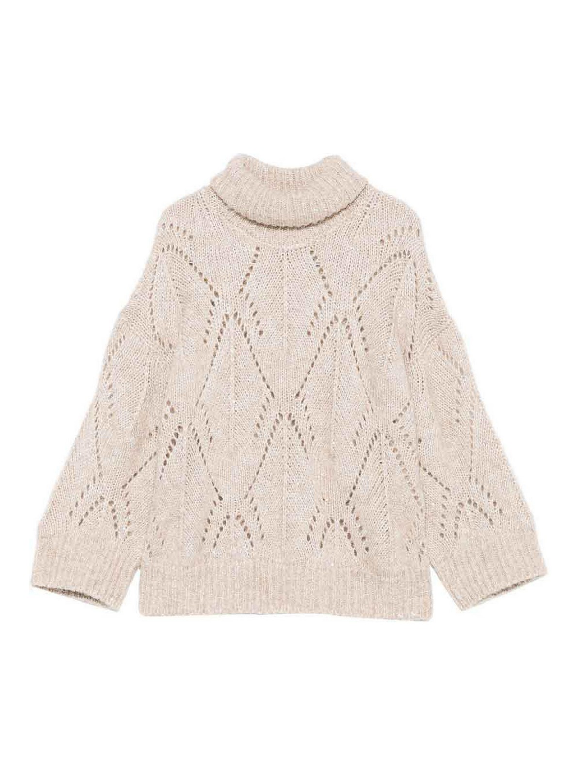 Col roulé beige à col roulé et manches longues en maille ouverte