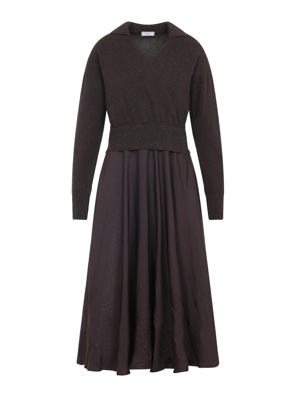 Robe marron ébène Peserico confectionnée en mélange, col pointu en V, col rond, col rond, épaules tombantes, manches longues, poignets côtelés, A, jupe cintrée, cheville, longueur, ourlet droit, coutures ton sur ton