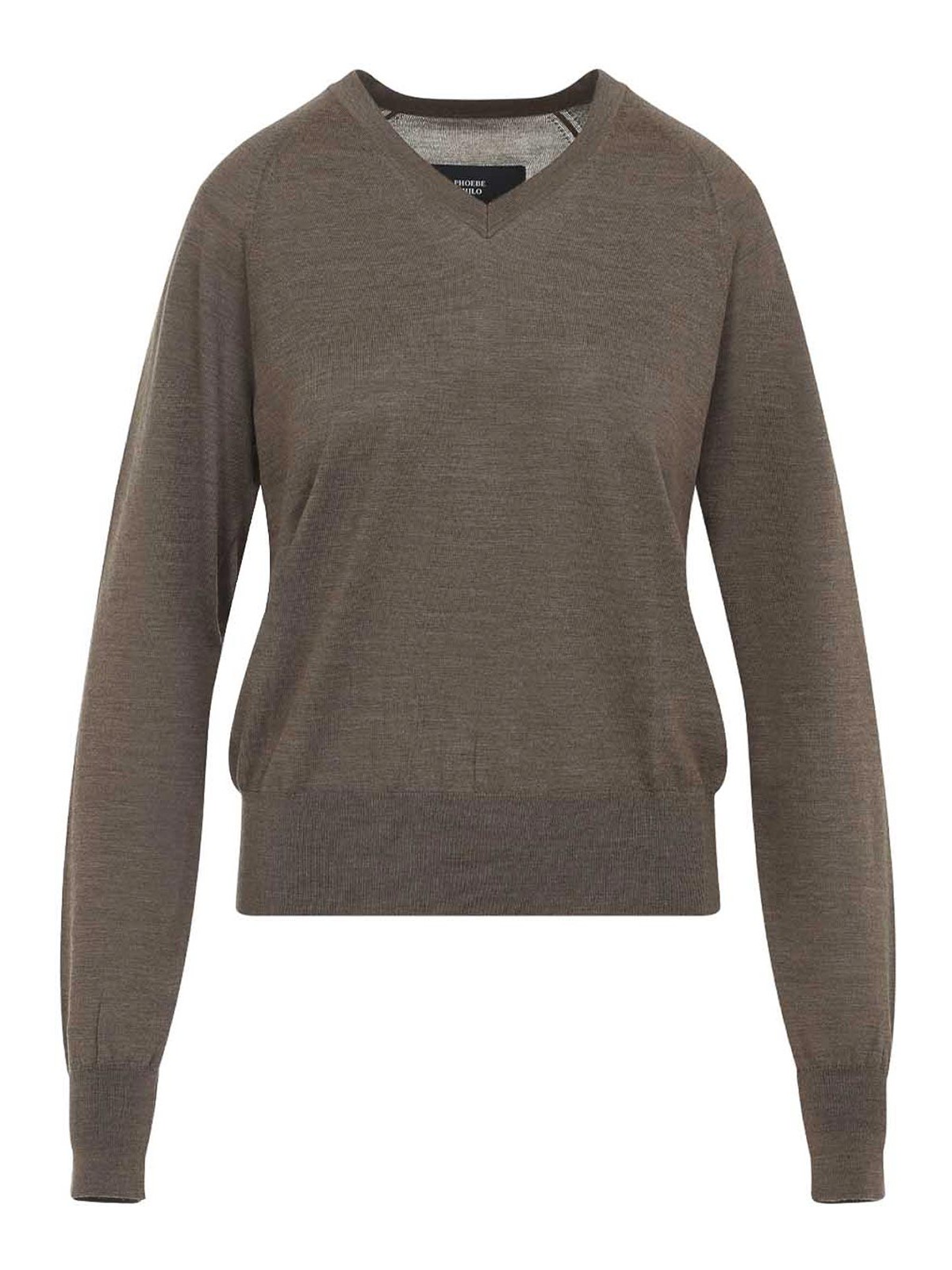 Pull Phoebe Philo en V rétréci, col, col, marron, confectionné en V fin marron, encolure, manches longues, col côtelé, poignets et ourlet