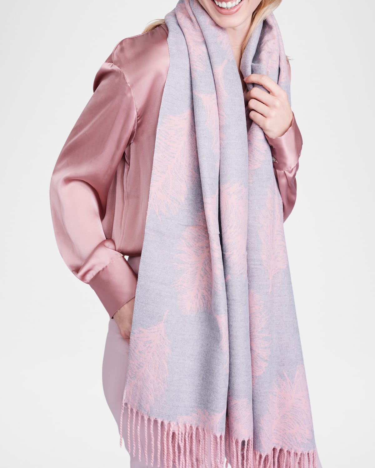 Pia Rossini "Raquela" scarf featuring feather intarsia Approx. 79"L x 24.5"W Fringed edges May be styled multiple ways Polyester/viscose/nylon/polyamide Wipe clean Imported