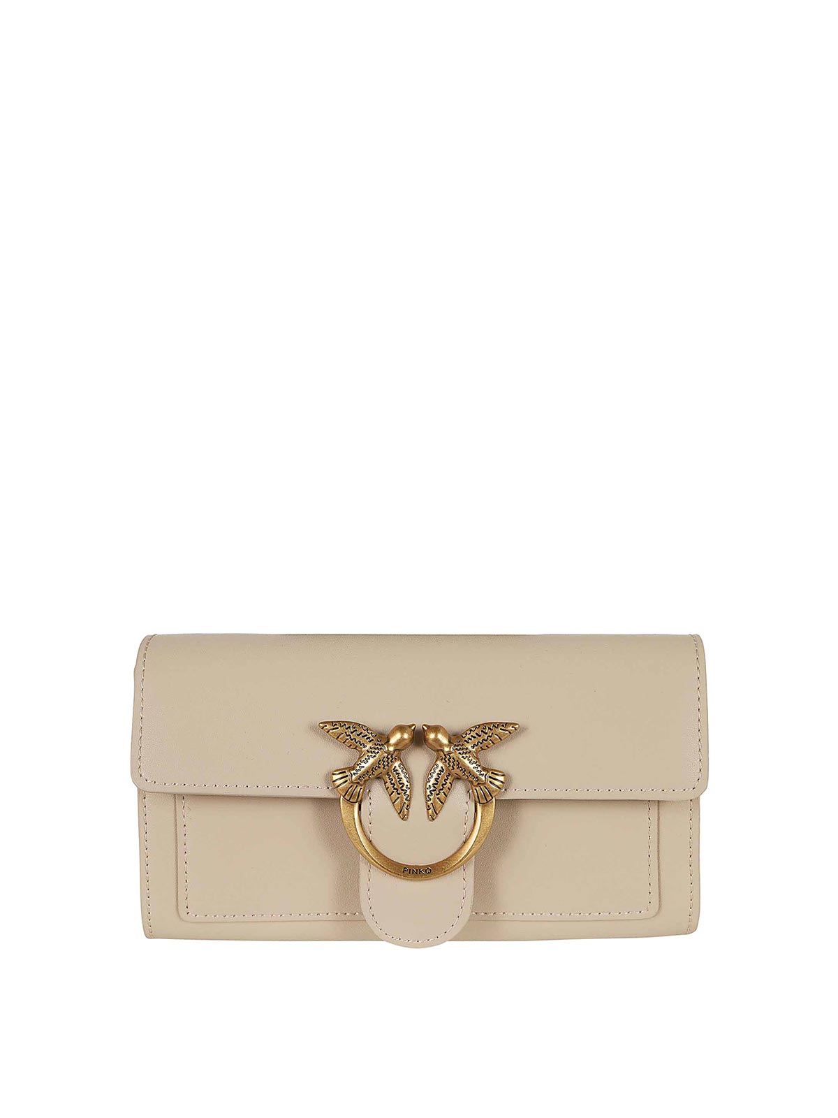 Portefeuille Love Bag en Soft Hand de Pinko avec bouton caché à l'intérieur en polycoton et divisé en quatre compartiments, dont un zippé et deux avec emplacements pour cartes de crédit. La chaîne ronde en métal vous permet de porter le portefeuille comme un sac à bandoulière et la boucle amovible en forme de tourtereau