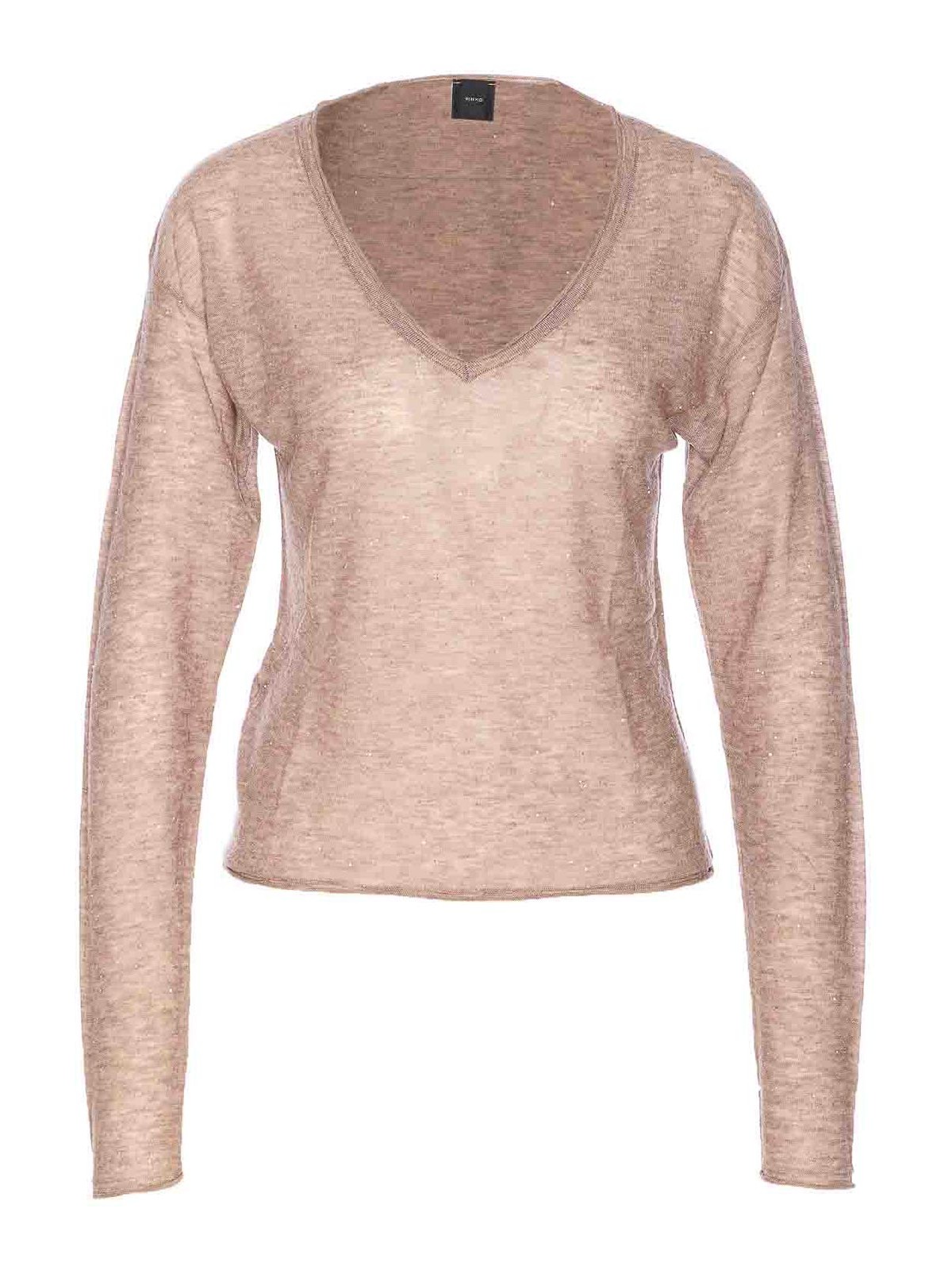 Pull salomone beige Pinko, col en V, micropaillettes sur l'ensemble, effet transparent, logo au dos