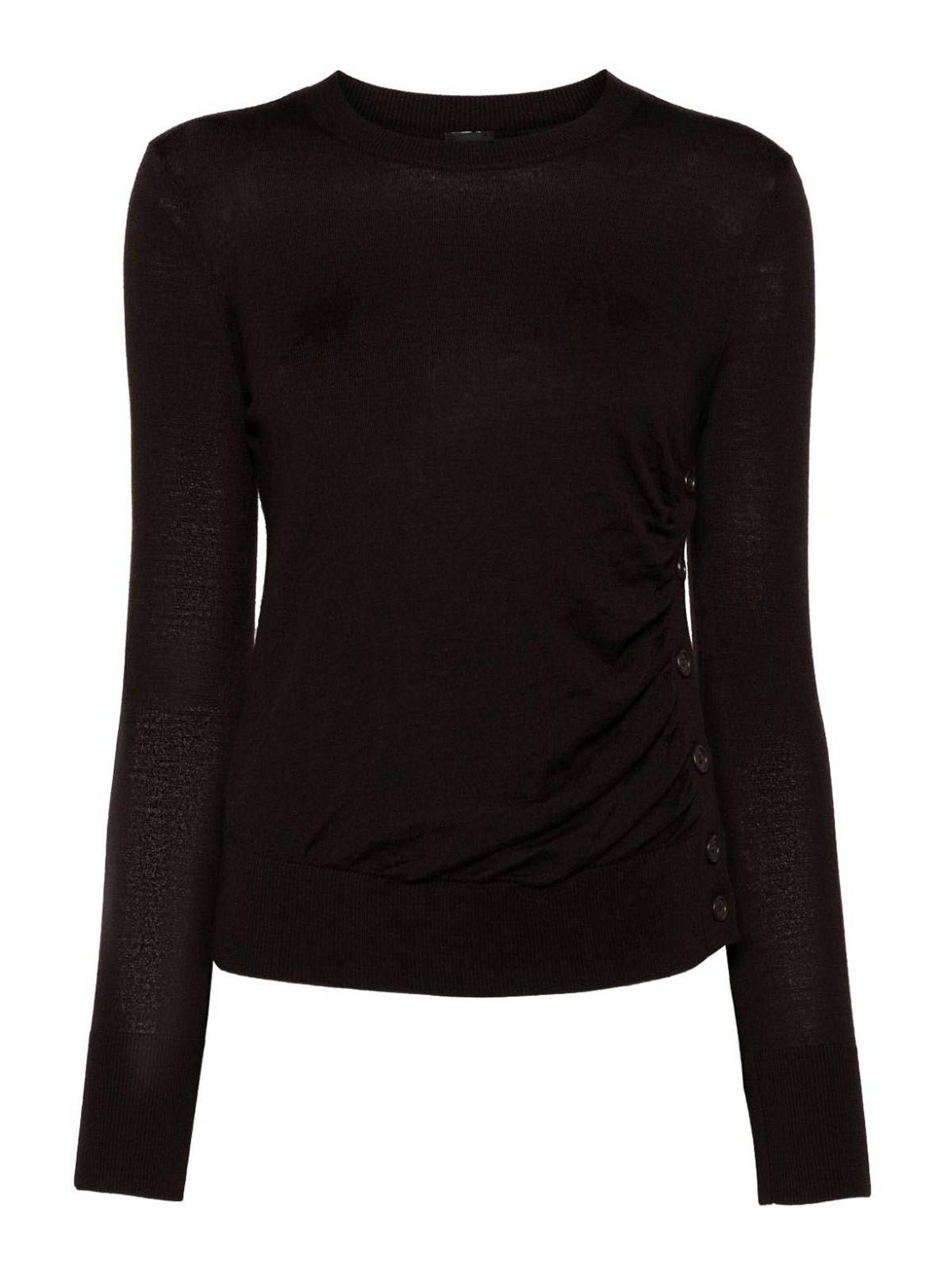 Empiècements côtelés en maille fine marron café, col rond, manches longues, poignets et ourlet côtelés, bouton, fente latérale
