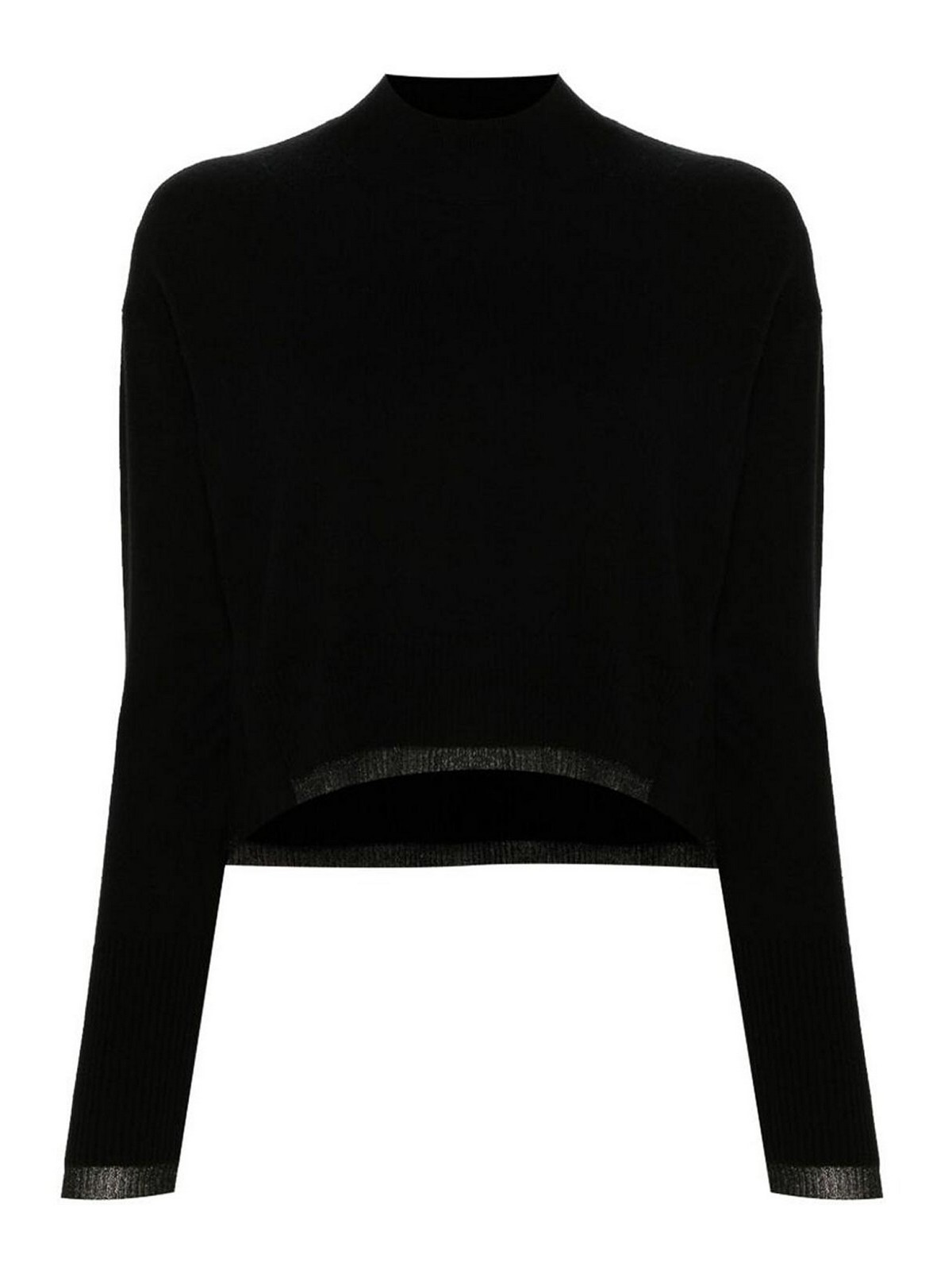 Construction en maille mélangée noire, col montant, manches longues, poignets et ourlet côtelés, ourlet et enfilage haut et bas