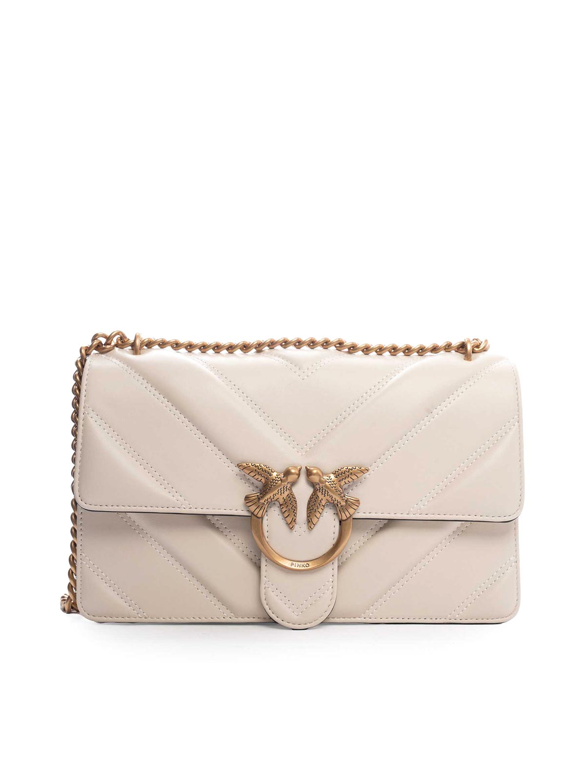 Rabat matelassé en cuir nappa avec boucle en forme de tourtereau, bandoulière en chaîne avec bandoulière réglable, poche intérieure zippée, perceuse