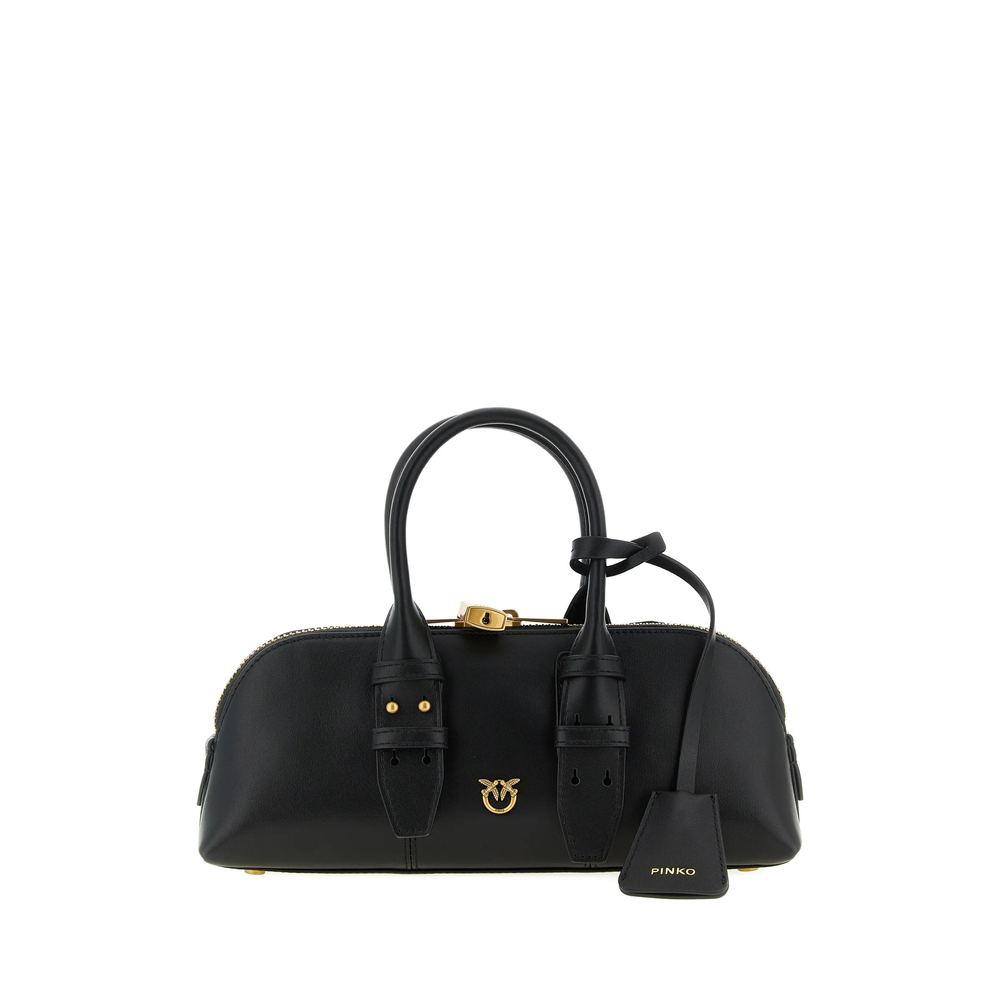 black leather metal logo adjustable removable shoulder strap top zip closure padlock detail metal feet