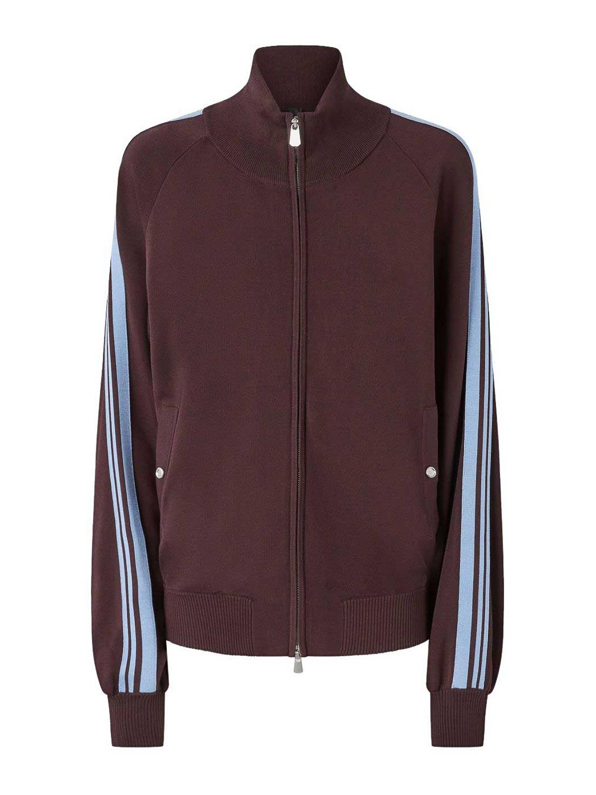 Le sweat-shirt zippé « Panarea » bordeaux de Pinko présente des bandes latérales contrastantes le long des manches