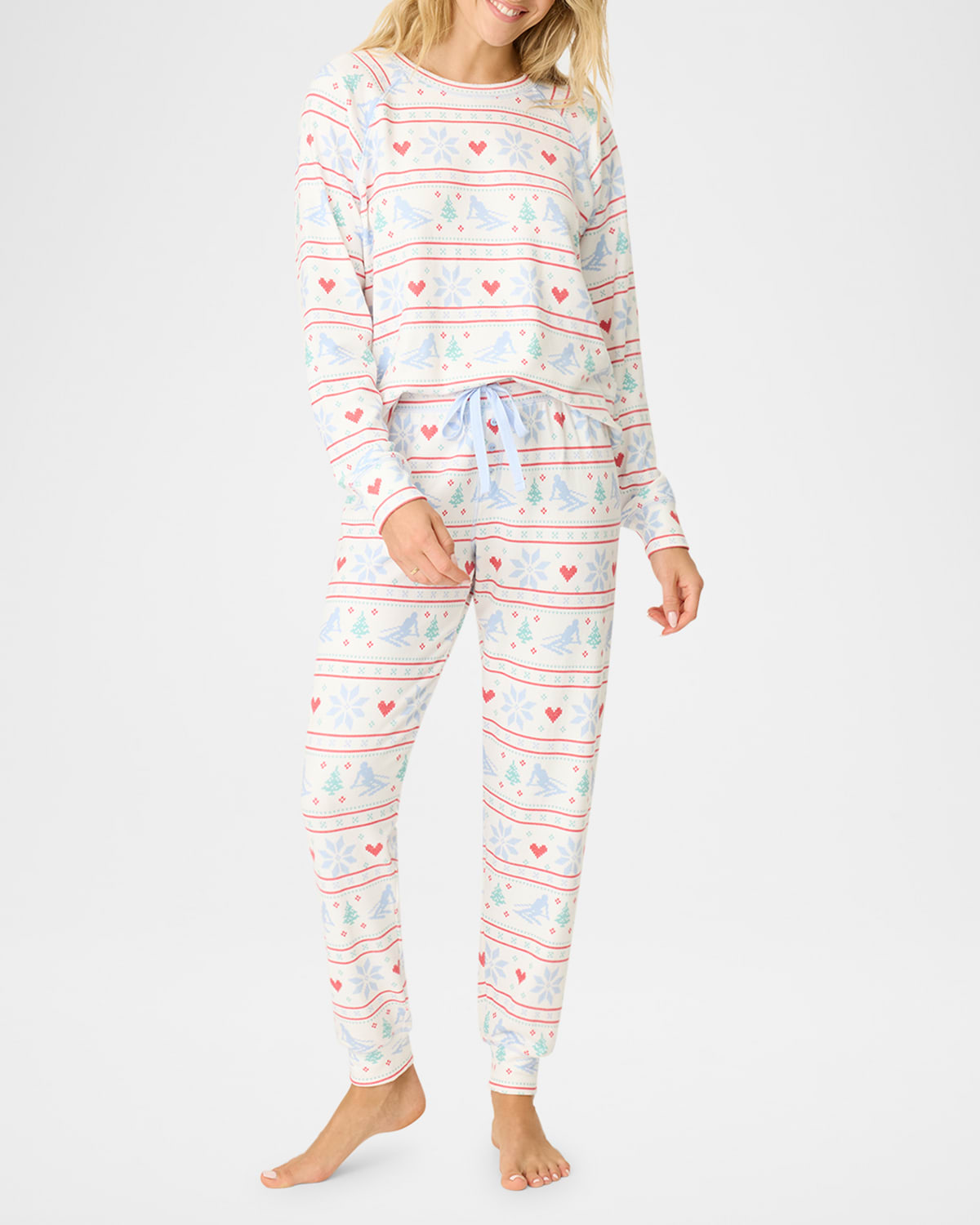 PJ Salvage "Apres All Day" pajama set features a geometric snowflake, heart, and skier print Approx. 23.5"L from shoulders to hem Crew neckline Long raglan sleeves Relaxed fit Pullover style Includes matching jogger pants Elasticized drawstring waistband Banded hems Full length Tapered legs Pullon style Polyester/rayon/cellulose acetate/elastane Imported