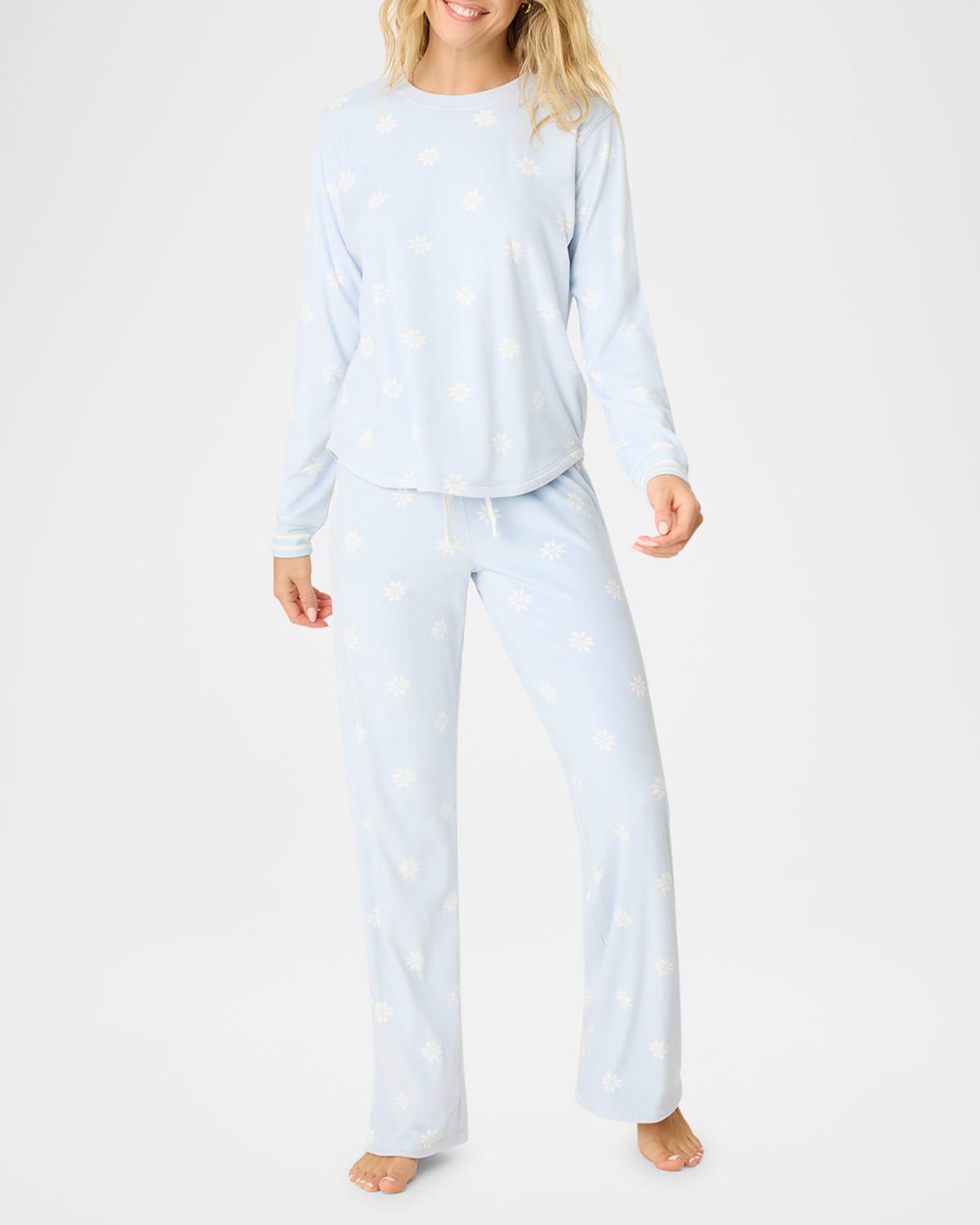 PJ Salvage "Apres All Day" pajama set in a snowflake print Approx. 24.5"L from shoulders to hem Crew neckline Long sleeves Relaxed fit Pullover style Includes matching pants Elasticized drawstring waistband Full length Straight legs Pullon style Polyester/elastane Imported