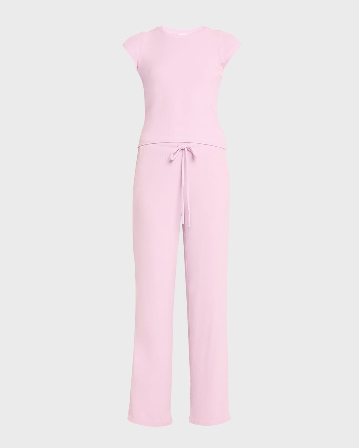 PJ Salvage "Lacey" ribbed lounge set with lace inset Approx. 20"L from shoulders to hem Crew neckline Cap sleeves Relaxed fit Pullover style Includes matching pants Elasticized drawstring waistband Full length Straight legs Pullon style Modal/elastane Imported