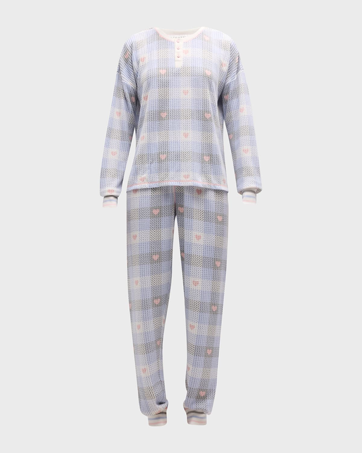 PJ Salvage "Ski Jammie" thermal pajama set in a floral print Crew neckline; partial button front Drop shoulders Long sleeves Hem side slits Relaxed fit Pullover style Includes matching pants Elasticized drawstring waistband Full length Tapered legs Pullon style Nylon/polyamide/rayon/cellulose acetate/elastane Imported